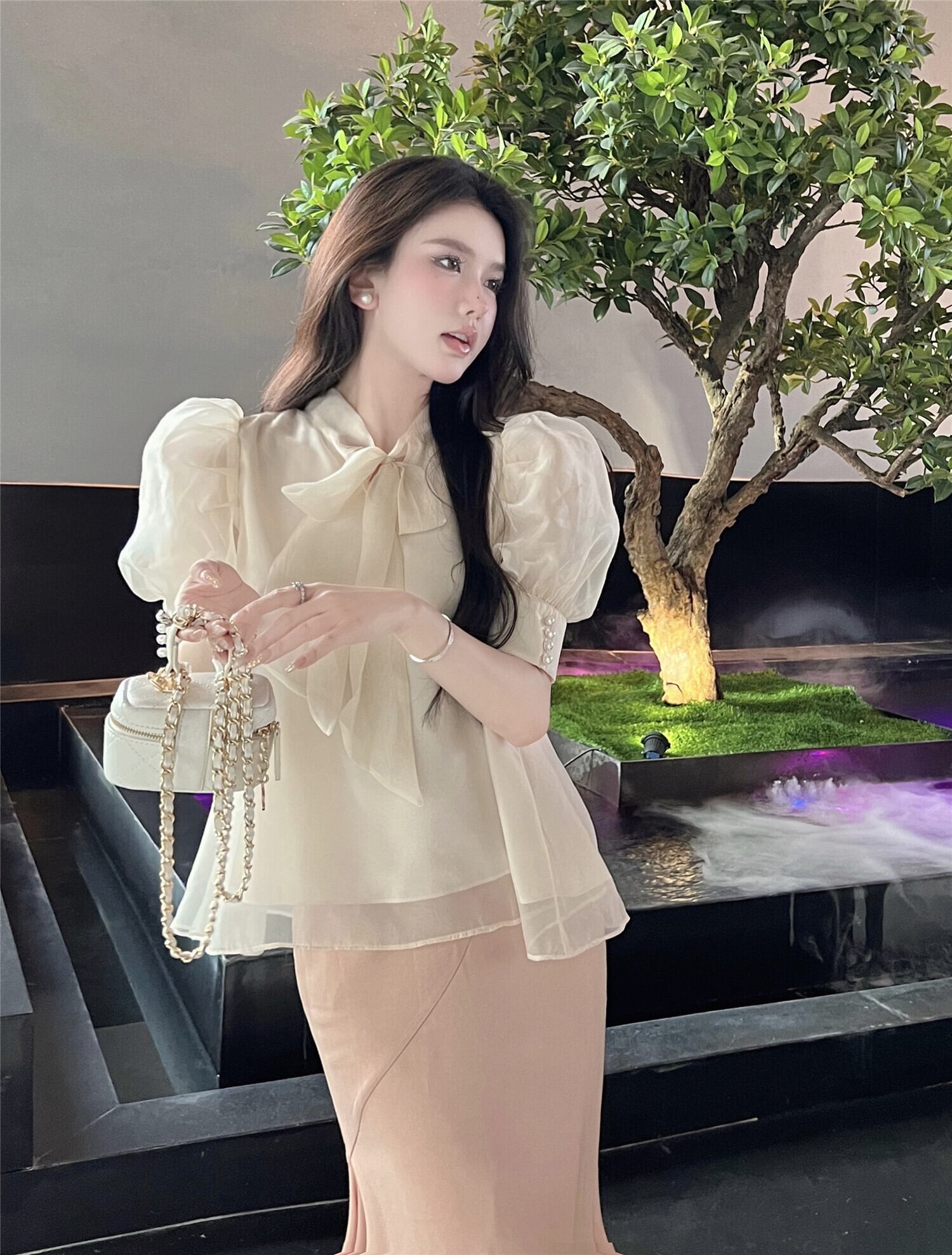 フレンチボウ半袖シャツレディースサマースイートアプリコットルーズプルオーバーパフスリーブシャツシックトップ リボン 大人ガーリー スウィート キュート カジュアル 夏物 bstraw77994030225 | beaute25