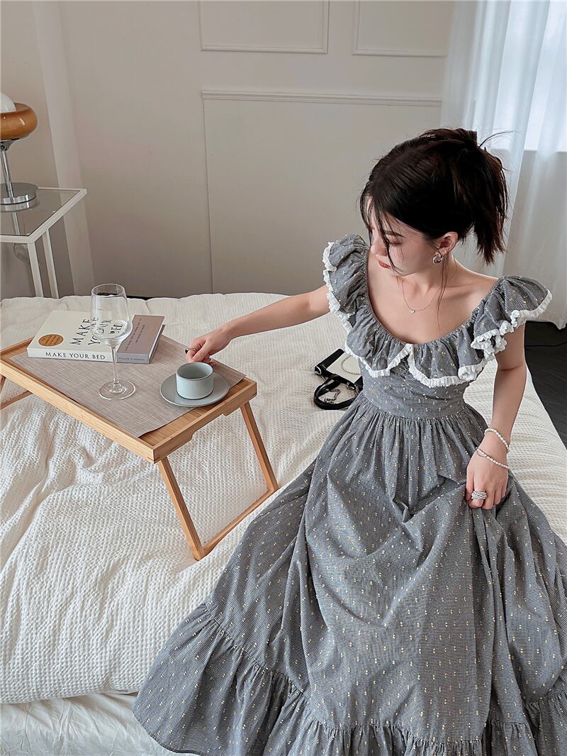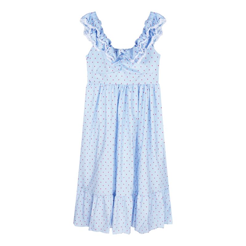 青い水玉フリルドレス女性の夏の甘いハイエンドセンスウエスト気質ノースリーブミドル丈スカート ブルー 大人ガーリー スウィート キュート カジュアル サマー 夏物 bstraw90137074073 | beaute25