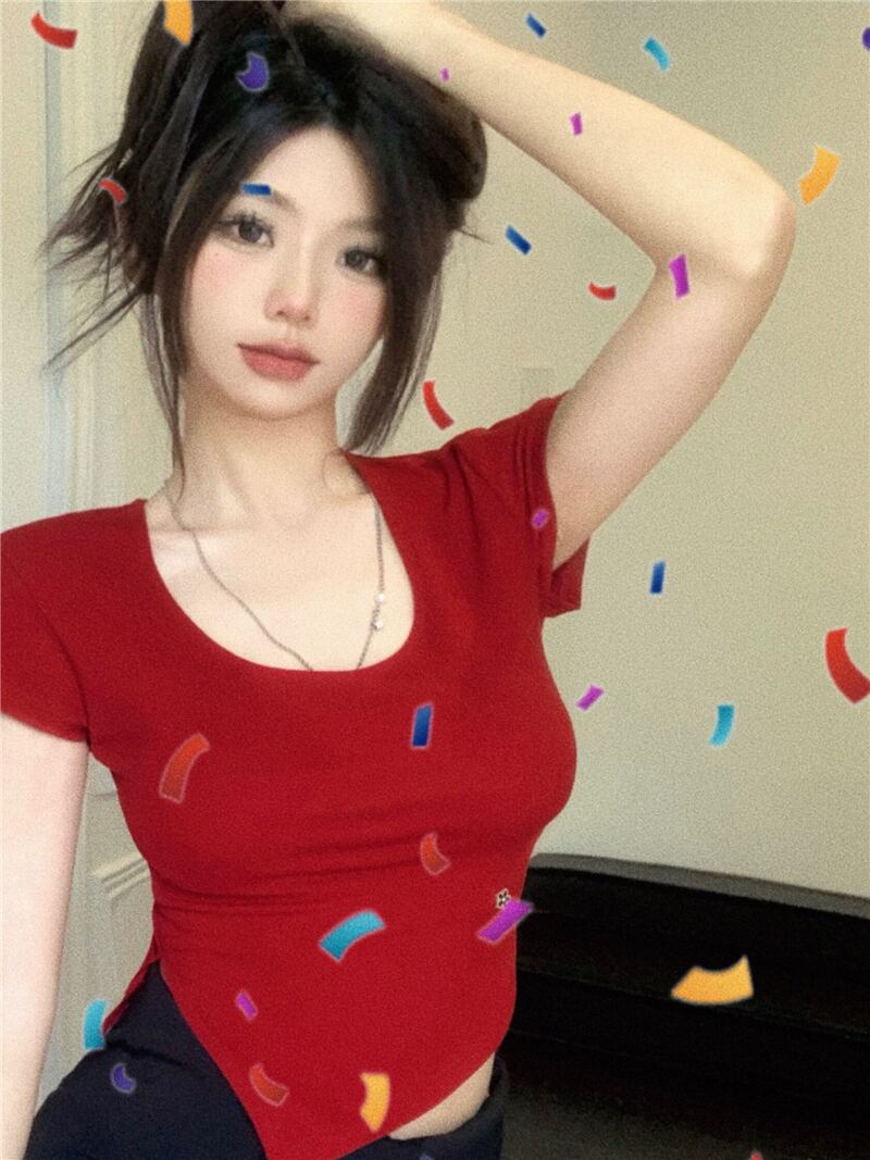 赤い不規則な半袖 T シャツ女性の 2022 年夏新しいセクシーな短い無地スリム スリム トップ ショート レッド サマー 夏物 Tシャツ ソリッドカラー bstraw85083507298 | beaute25