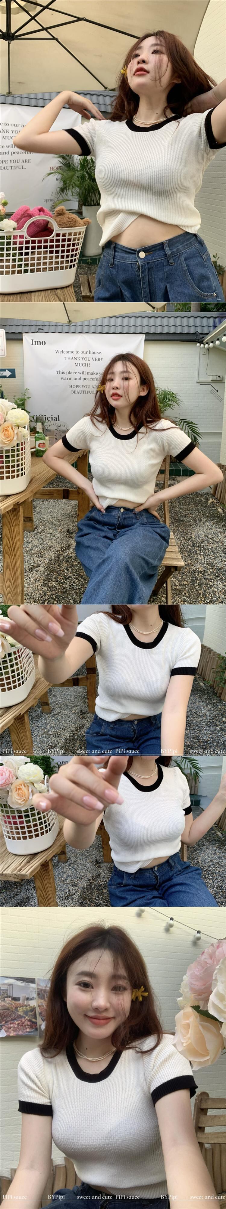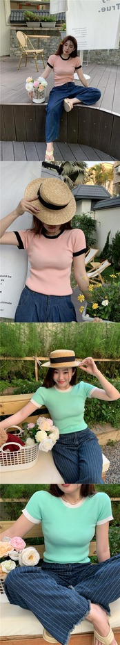 スウィートスパイスガールズ コントラストカラー 半袖 スリムフィット スレッドニット セーター レディース 2022年夏 薄手 薄手 ボトムス シャツ トップス ショート ハーフスリーブ 大人ガーリー キュート カジュアル サマー 夏物 bstraw5520969716 | beaute25