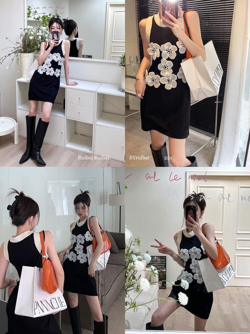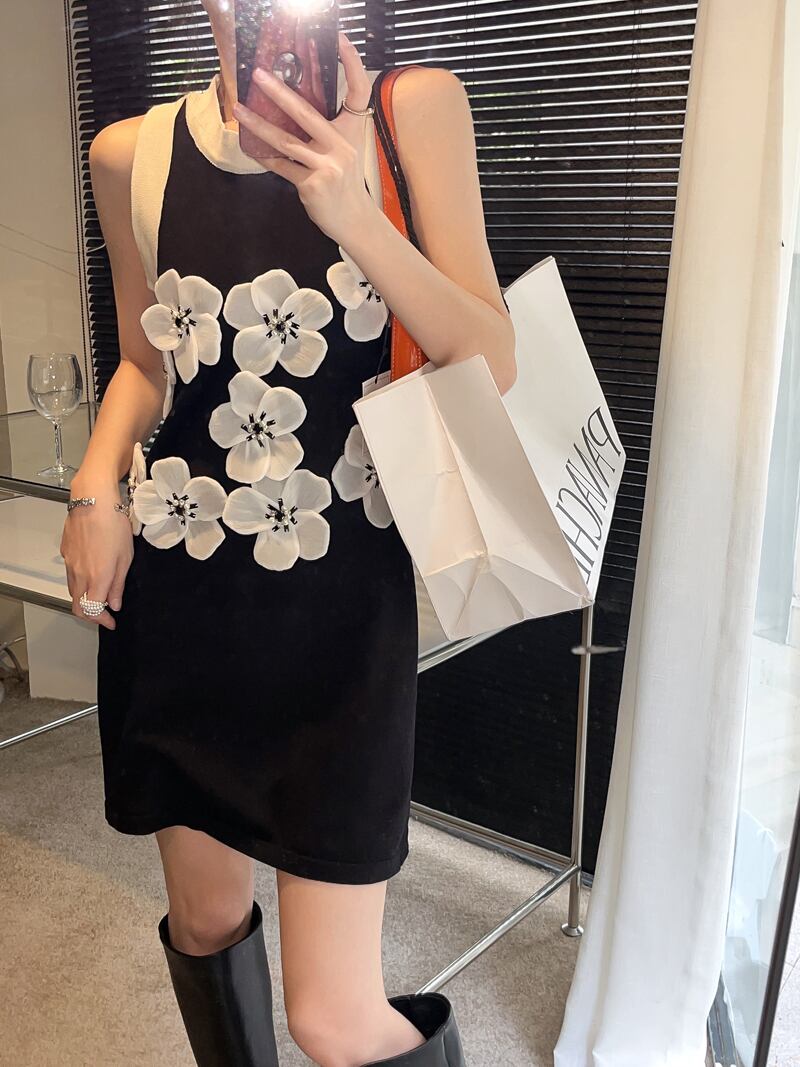 黒の立体的な椿の花のベストドレスの女性の夏の小さなカジュアルなAラインのゆったりしたノースリーブの短いスカート ショート ブラック サマー 夏物 フラワーデザイン bstraw28745763488 | beaute25