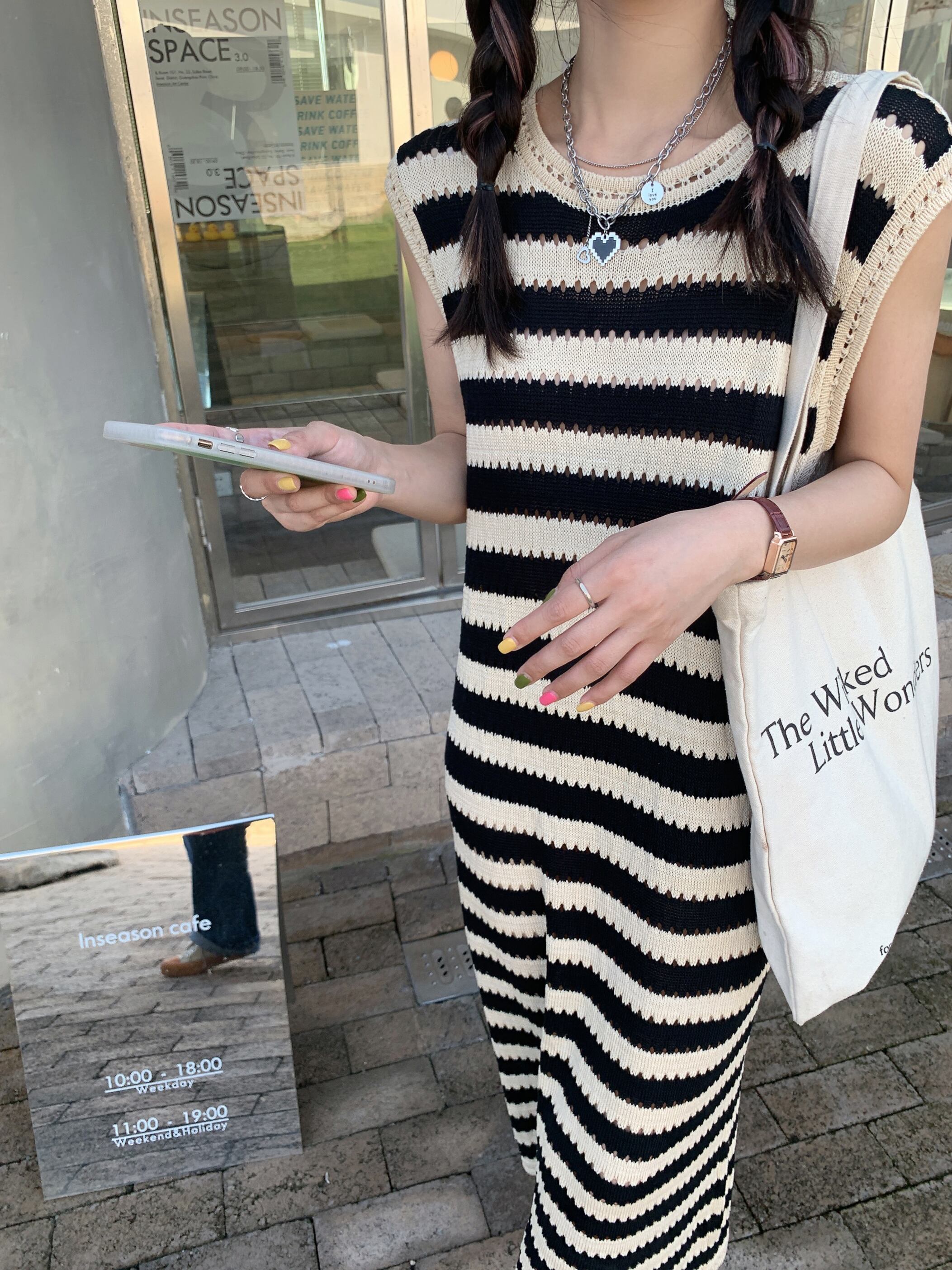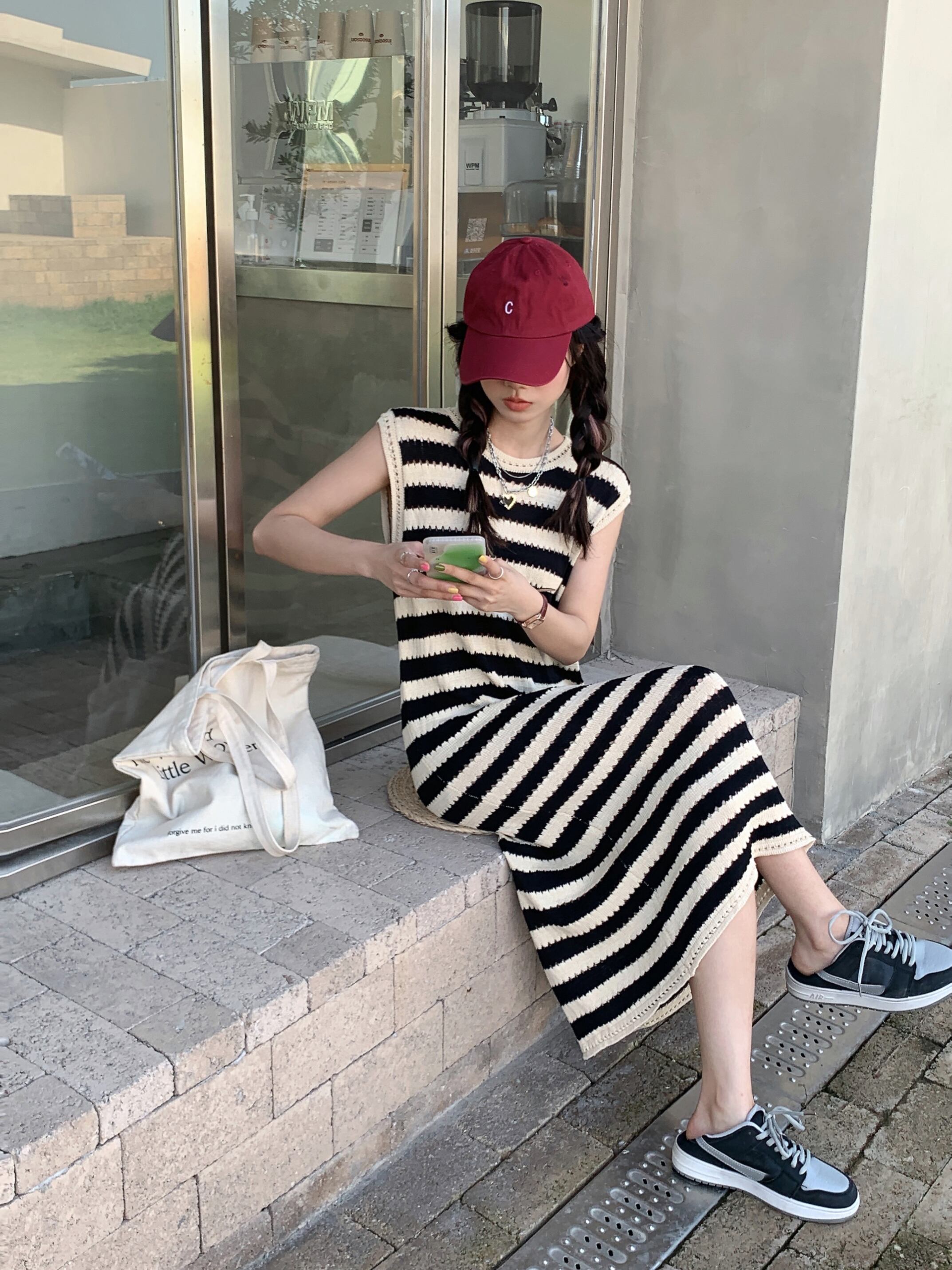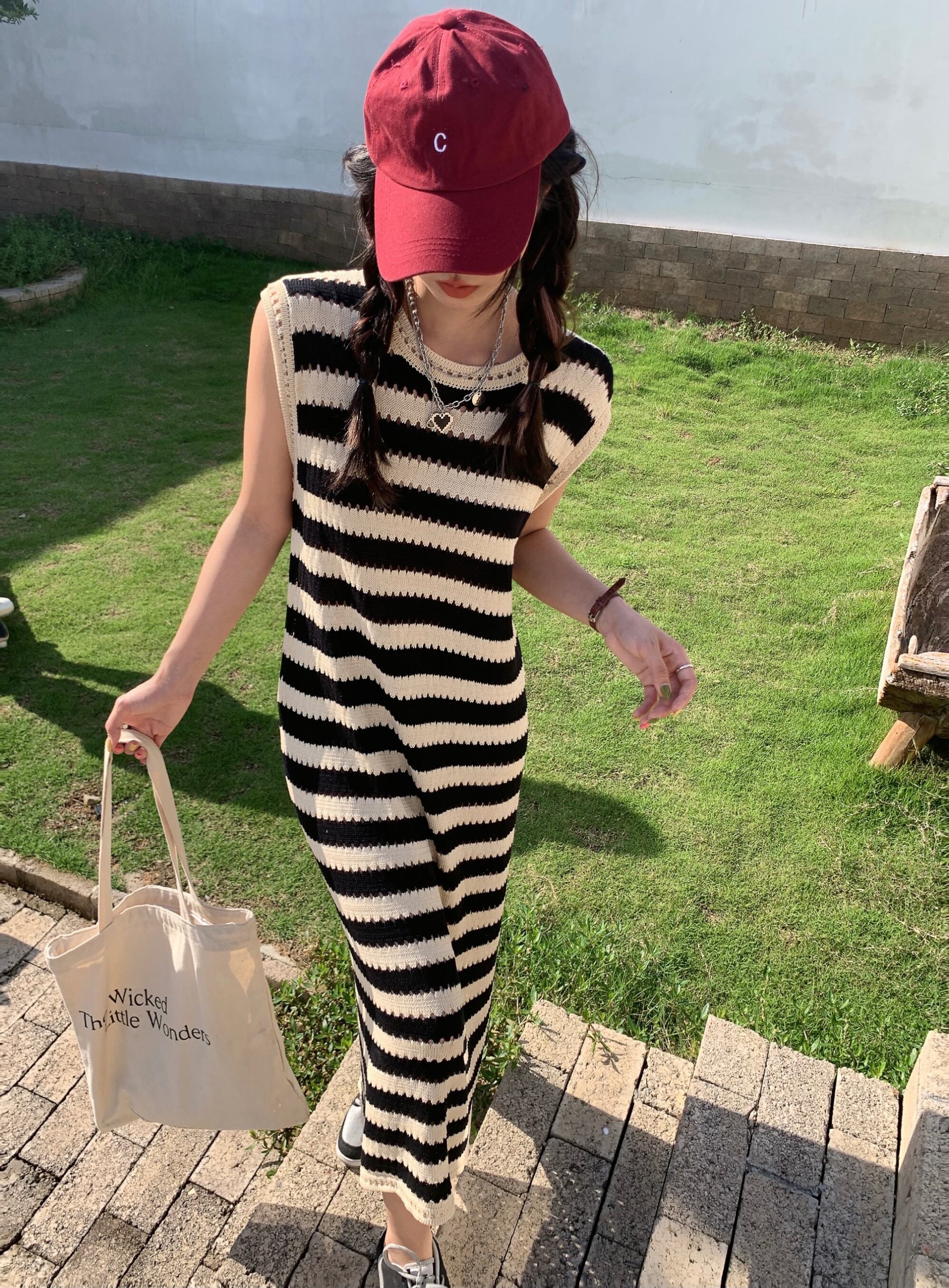 縞模様のニットドレスのバージョンの女性の夏の怠惰なスタイルのレトロなノースリーブのゆったりとした薄い気質のミドル丈のスカート サマー 夏物 ストライプ bstraw34536282362 | beaute25