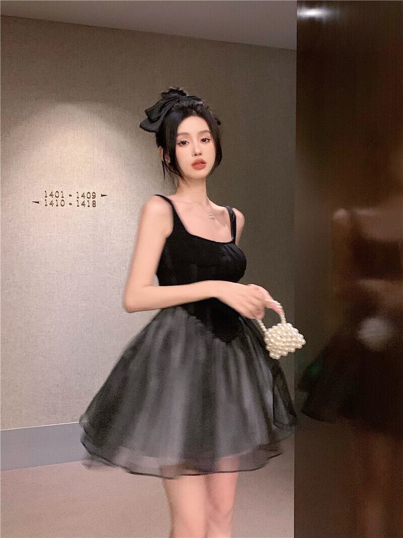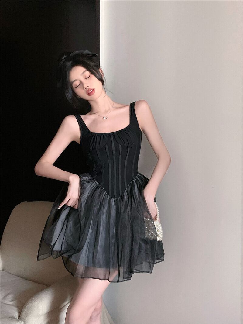 黒のハイエンド サスペンダー ドレス女性の夏の冷たい風ショート スカート ノースリーブ フィッシュボーン薄いプリンセス スカート ブラック サマー 夏物 bstraw51274612838 | beaute25