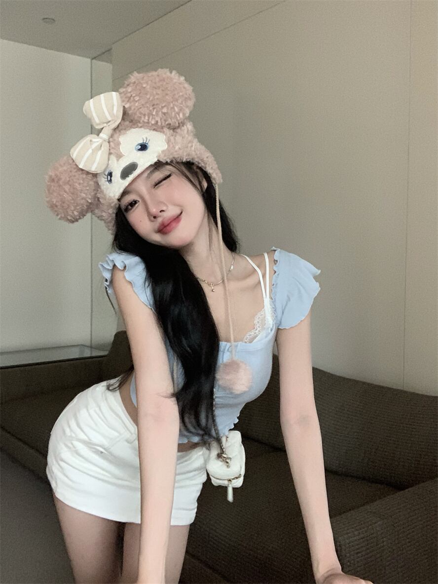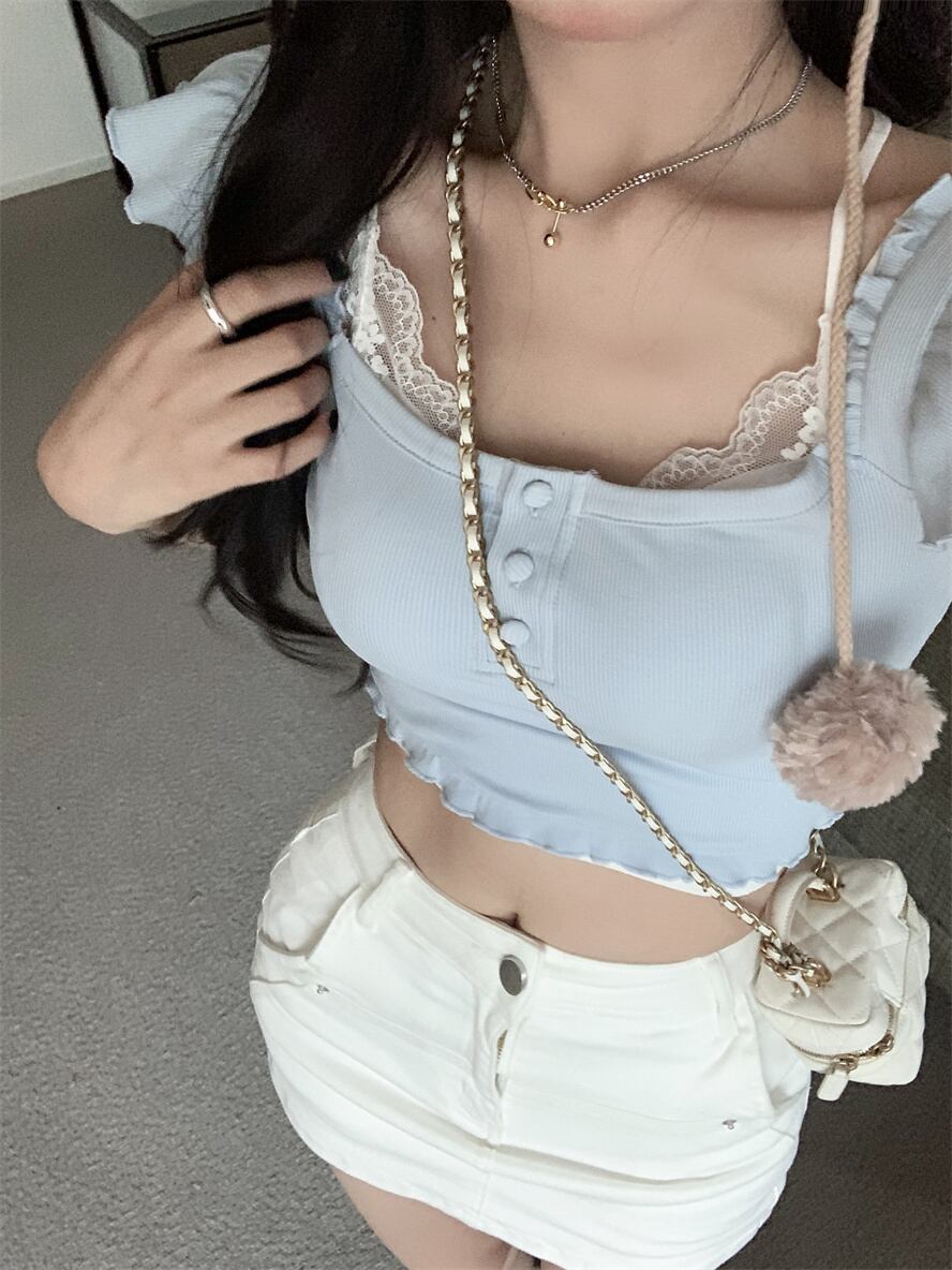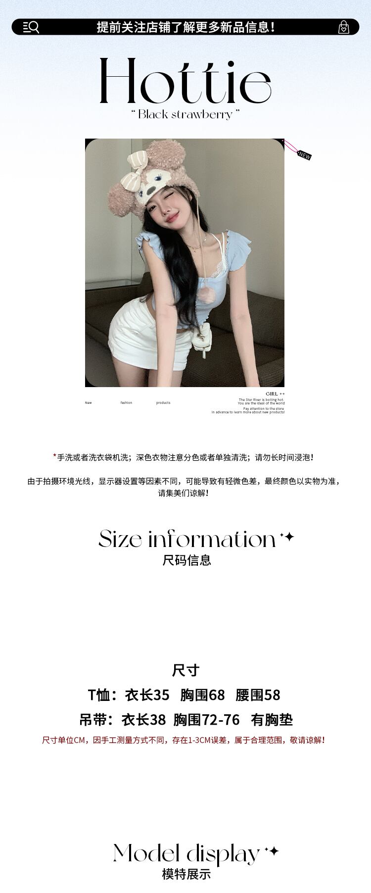 ブルーリトルフライングスリーブスクエアネックTシャツレディースサマースイートセクシーショートスリムレースサスペンダートップ2点セット 大人ガーリー スウィート キュート カジュアル 夏物 スクウェア bstraw79342688625 | beaute25