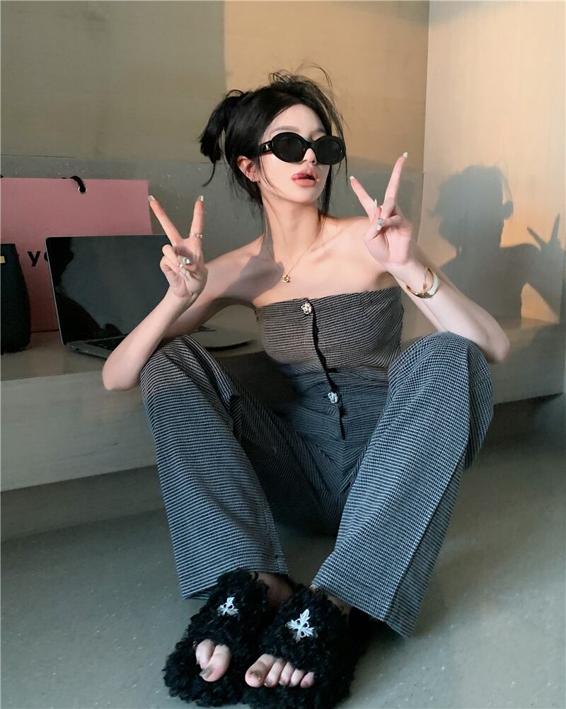 グレーの高品質のモップ カジュアル パンツ女性の夏のショー薄いハイ ウエスト チューブ トップ ジャンプ スーツ ストレート パンツ ズボン ハイウェスト サマー 夏物 bstraw74457647894 | beaute25
