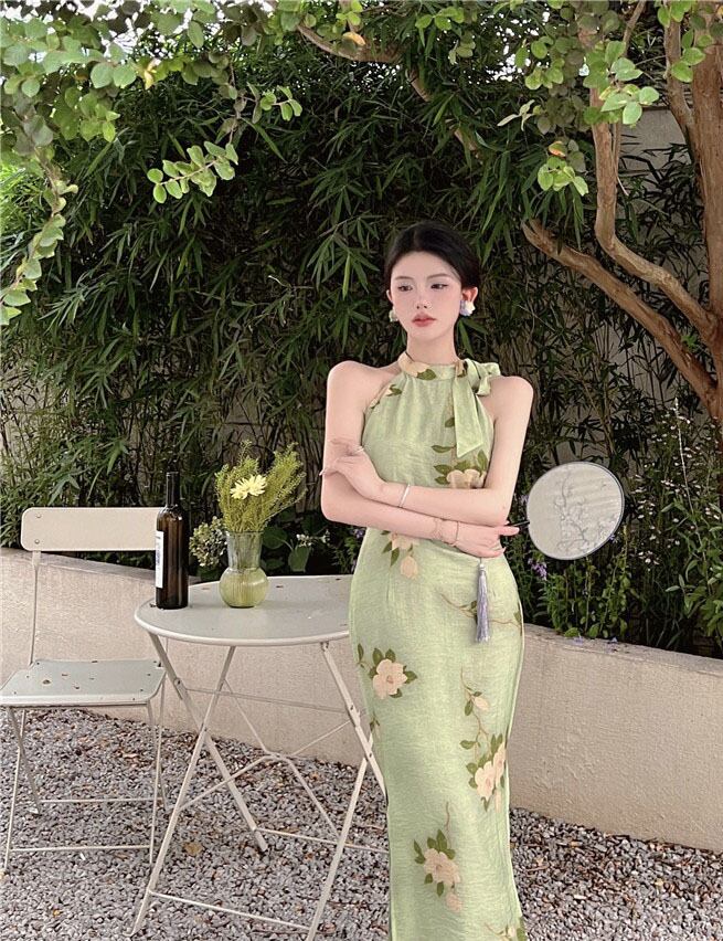 緑のレトロな改良されたチャイナ ドレス女性の夏の花セクシーな新しい中国風のスプリット ミッドレングス スカート サマー 夏物 グリーン フラワーデザイン bstraw90014842618 | beaute25