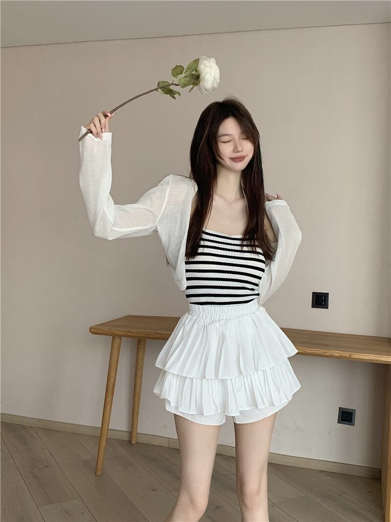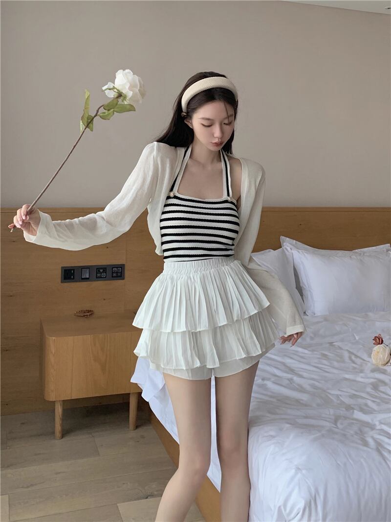 色:ストライプホルターベスト,ホワイトサンスクリーンカーディガン,黒スカート,白いスカート