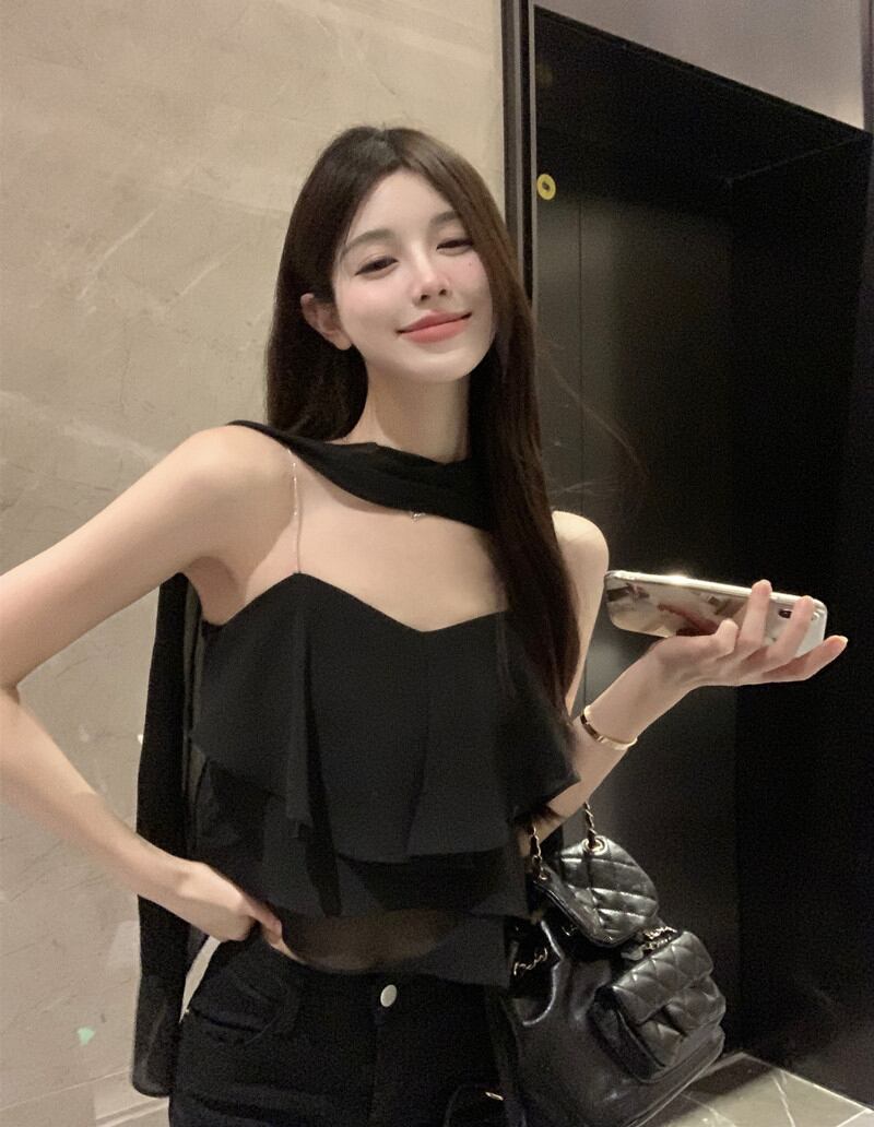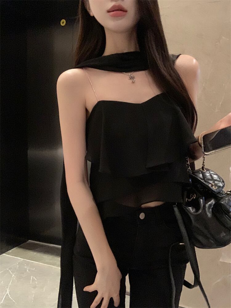 シフォン キャミソール レディース 夏 フリル フレンチ ブラック レディース ストリーマー セクシー アウター ショート トップス ラッフル サマー 夏物 bstraw96817243479 | beaute25
