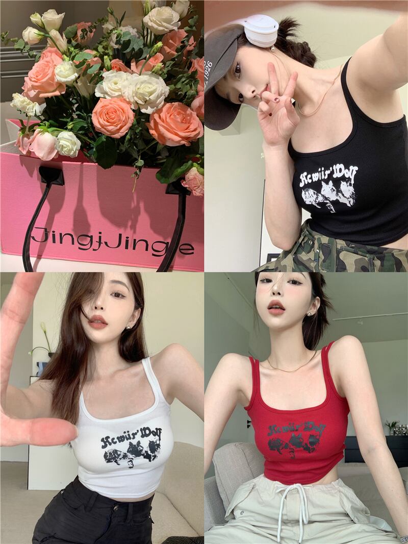 レッド ノースリーブ ショート キャミソール レディース サマーイン スリム プリント トップスとタイドで甘くて涼しげ 大人ガーリー スウィート キュート カジュアル 夏物 bstraw32965678033 | beaute25