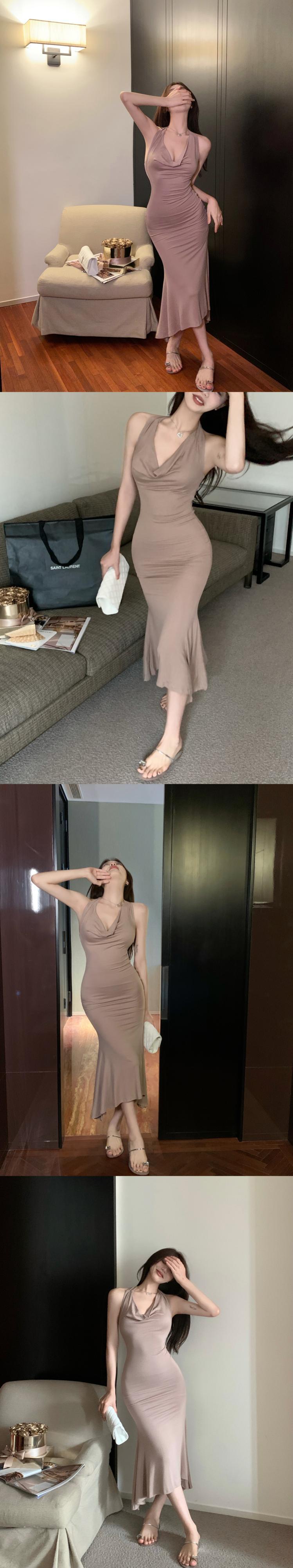 ピンク V ネック ホルター ドレス女性の夏のヘップバーン スタイル ノースリーブ ウエスト セクシーなミドル丈パッケージ ヒップ フィッシュテール スカート サマー 夏物 Vネック bstraw61593299871 | beaute25