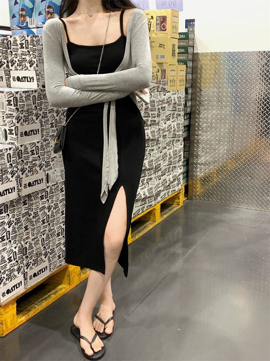 ブラックスプリットセクシーなサスペンダードレスフェアリーサマーピュアデザイアスタイルリトルブラックドレスノースリーブミッドレングスヒップスカート 夏物 bstraw56224953727 | beaute25