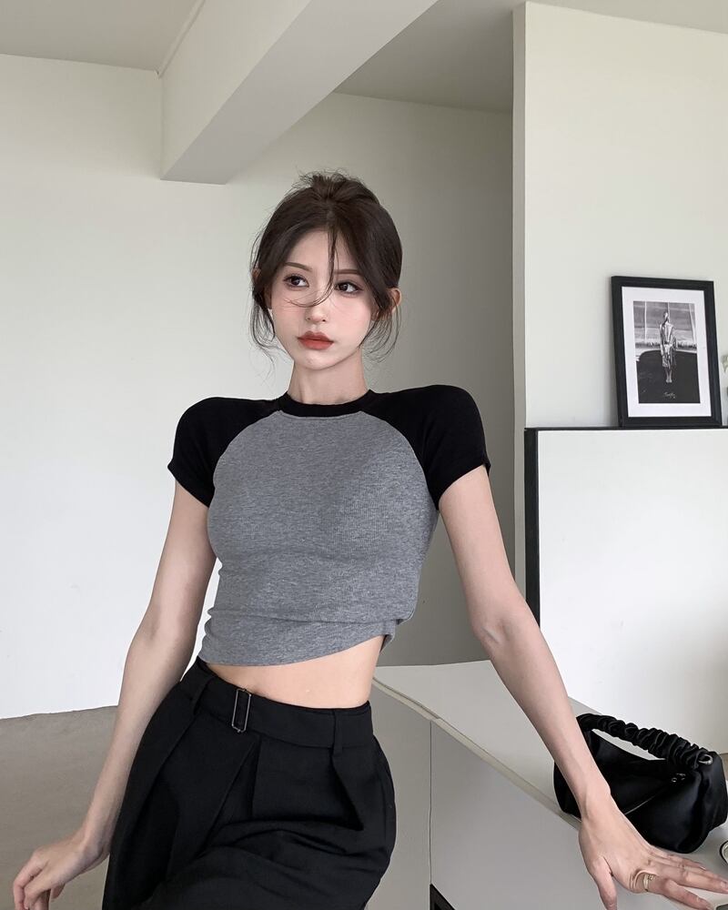 アメリカンスタイル レトロ カラーブロック 半袖 フロントショルダー Tシャツ レディース サマー スリムフィット 細身 小さめ デザイン ニッチトップ 夏物 bstraw67058901055 | beaute25