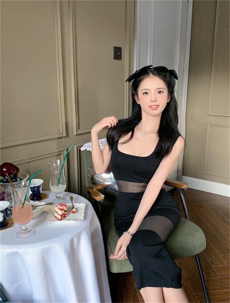 黒のスクエアネックニットベストドレス女性の夏のノースリーブのセクシーなミドル丈のハイエンドパッケージヒップスカート ブラック サマー 夏物 スクウェア bstraw21102311537 | beaute25