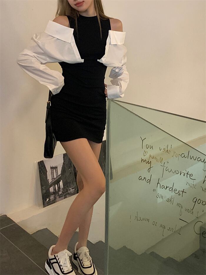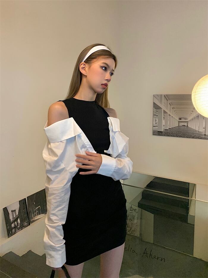 フェイク ツーピース ドレス女性の秋のシャツ長袖ステッチ ショート スカート ストラップレス ウエスト気質パッケージ ヒップ スカート ロング オータム 秋物 bstraw1203446760 | beaute25
