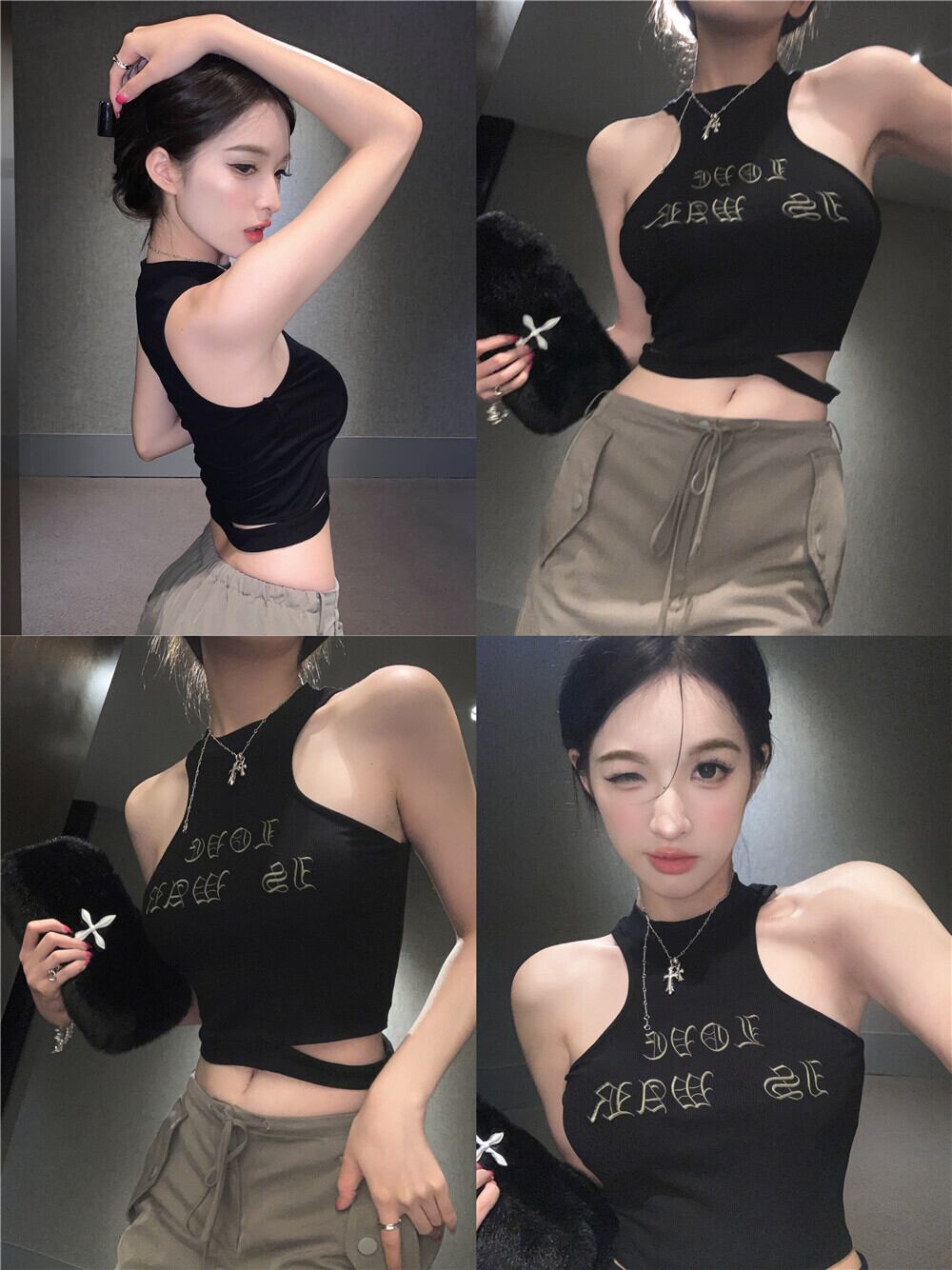 ブラック レトロ レター キャミソール レディース サマースパイス アメリカン タイト ワーカー ショート ノースリーブ トップス アウター 半袖 ハーフスリーブ 夏物 bstraw55974109125 | beaute25