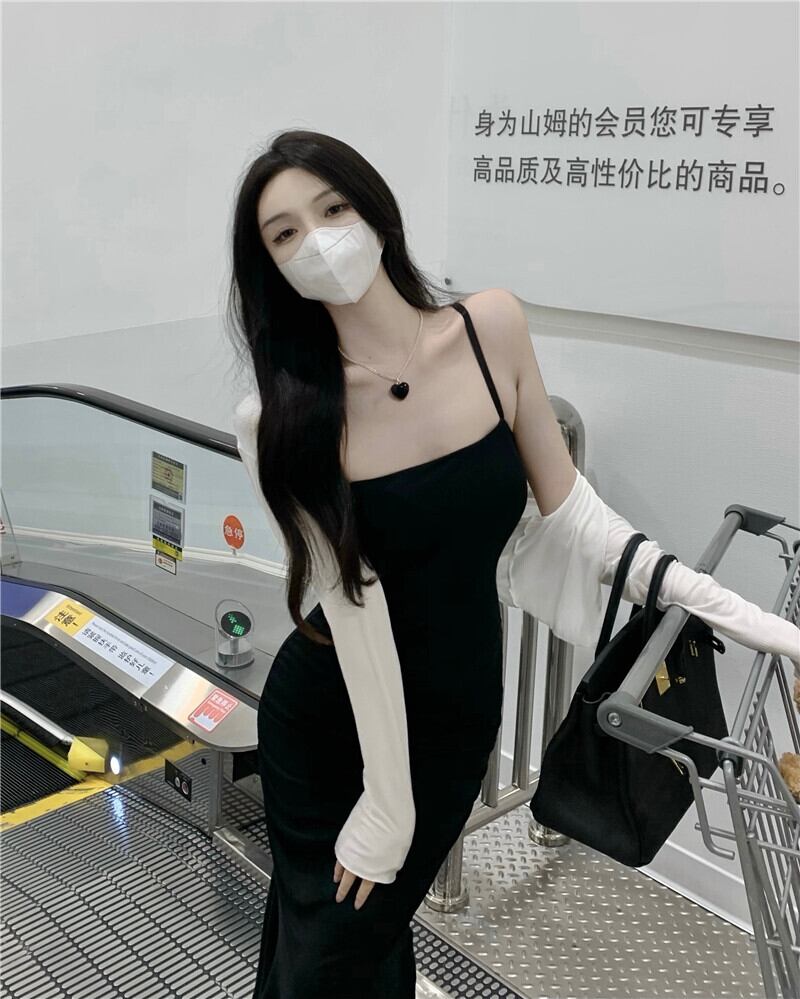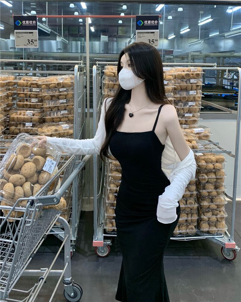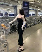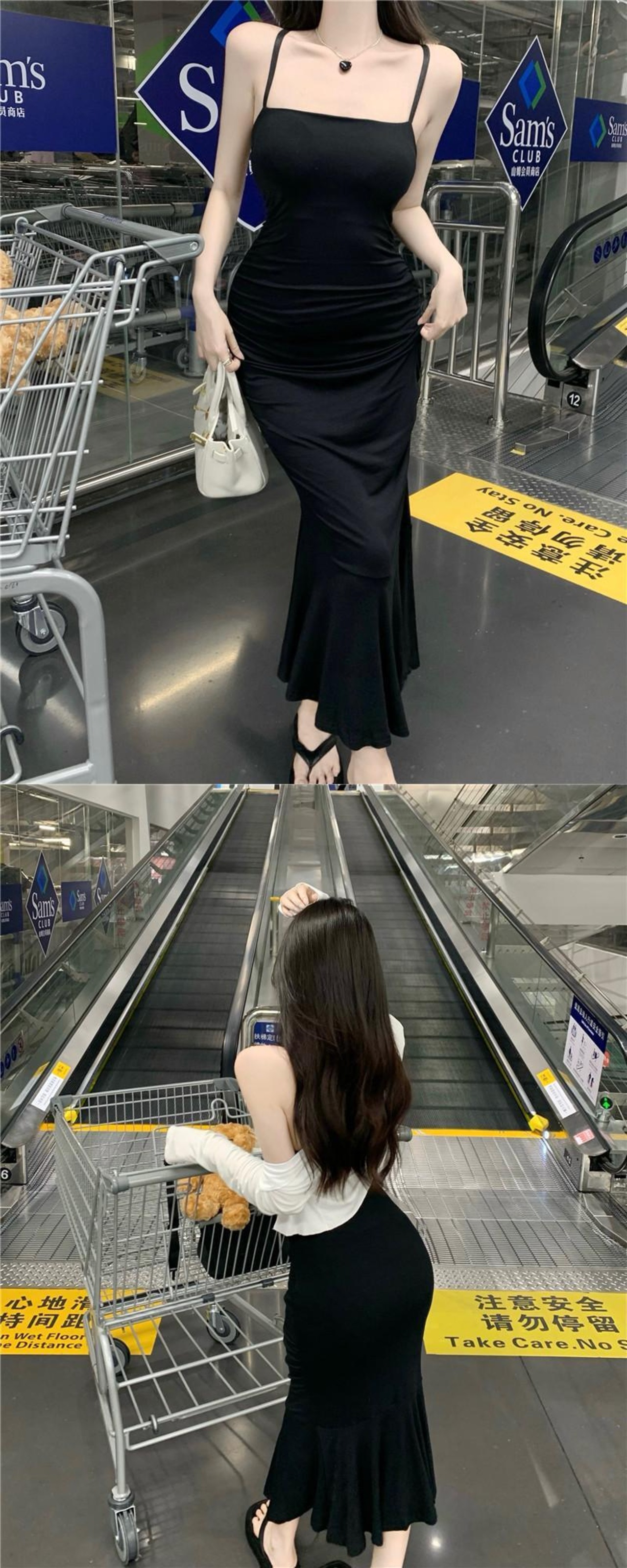 純粋な欲望のスタイルの黒のサスペンダー ドレス女性の夏のセクシーなミッドレングスのワンショルダーのハイエンド パッケージ ヒップ フィッシュテール スカート ブラック サマー 夏物 bstraw22279246569 | beaute25