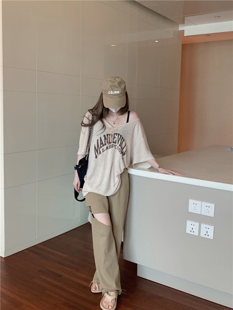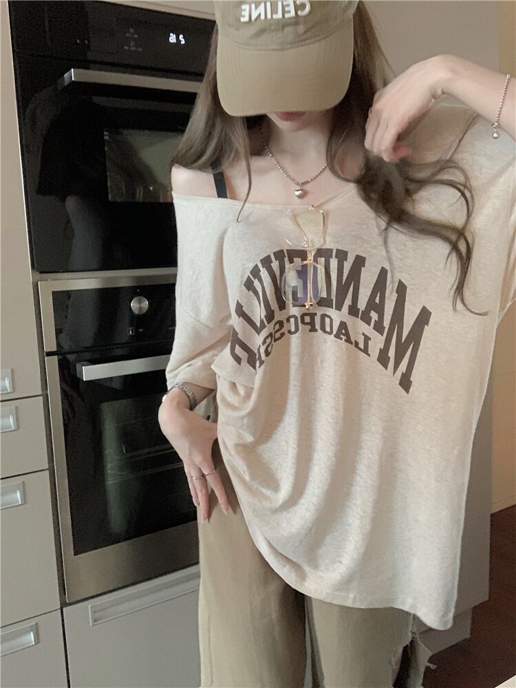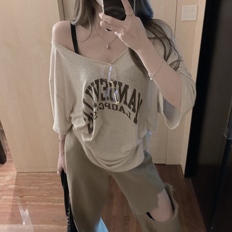 アメリカン Vネック フロントショルダー 半袖 Tシャツ レディース 夏 薄手 BF風 レトロ 大きめバージョン ルーズレター ミドル丈 トップス サマー 夏物 bstraw38078679787 | beaute25