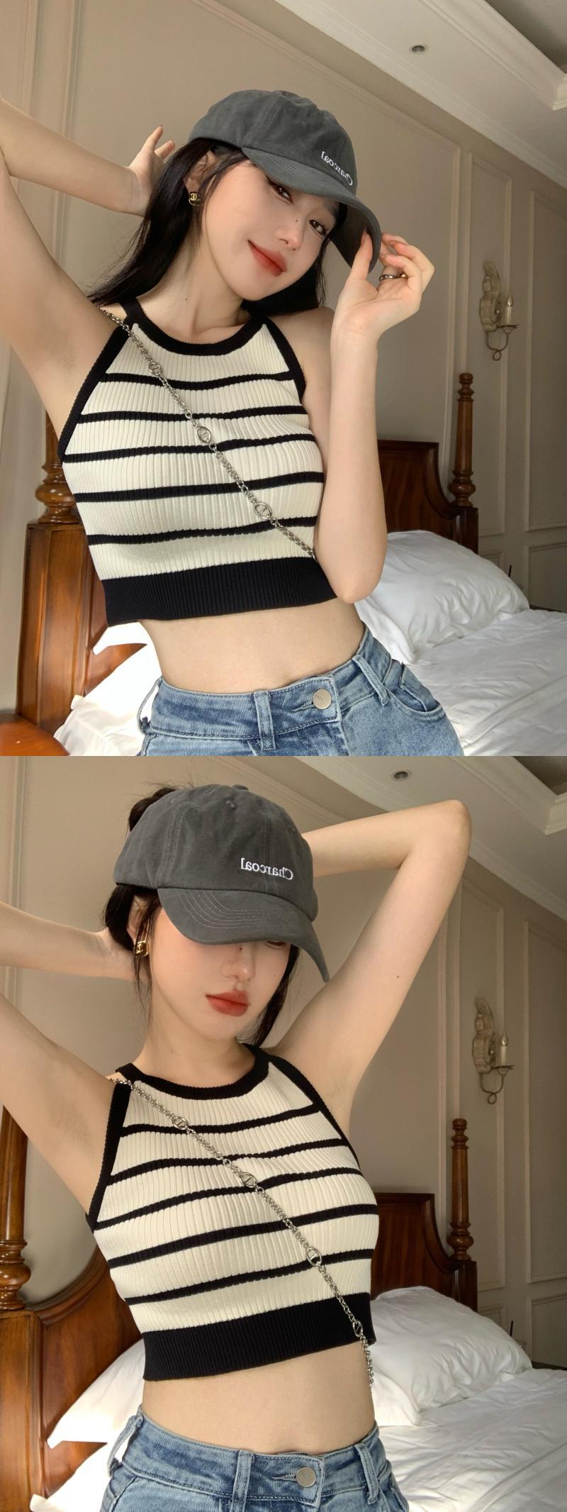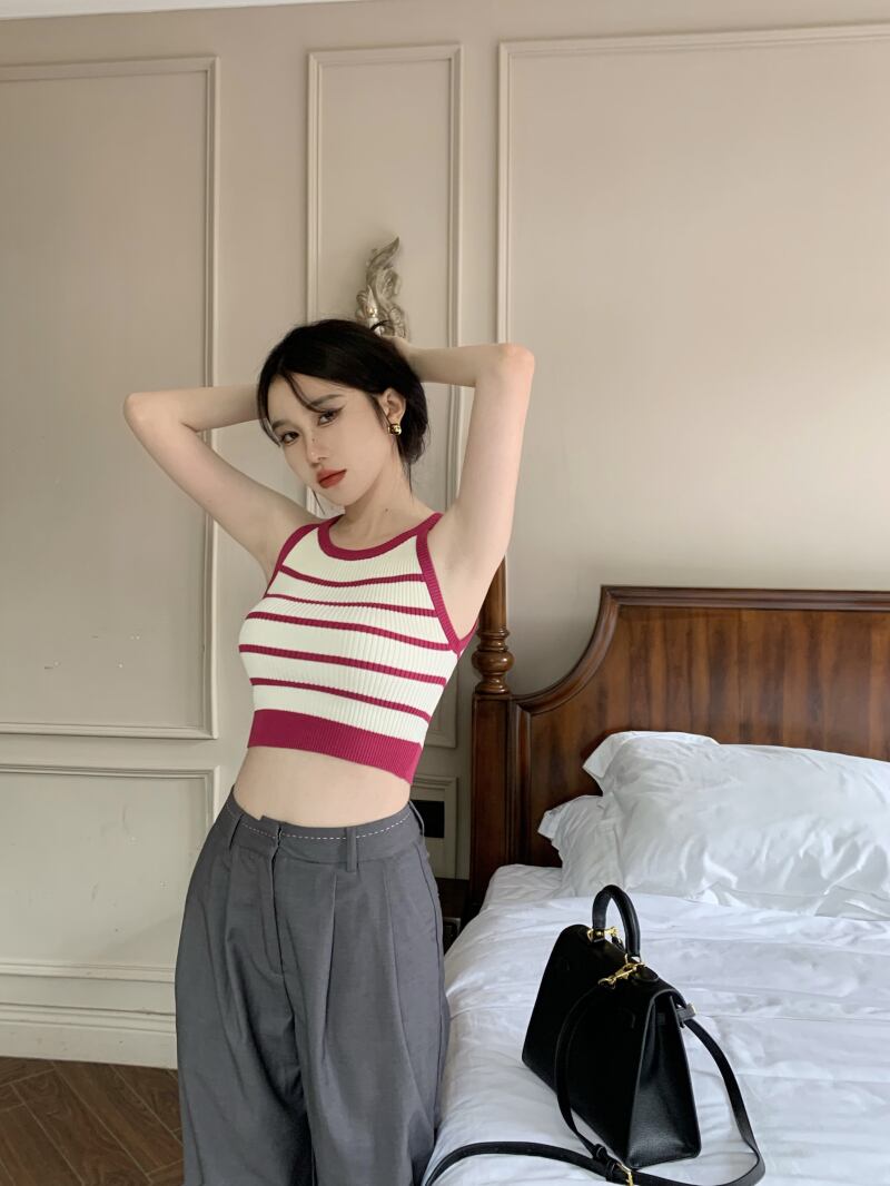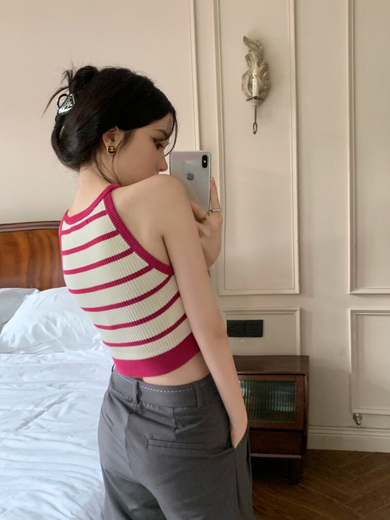 ストライプ ニット キャミソール ベスト レディース 夏 甘くて涼しげ ノースリーブ オフショルダー アウター スリム スリム ショート トップス 大人ガーリー スウィート キュート カジュアル サマー 夏物 bstraw35290079819 | beaute25
