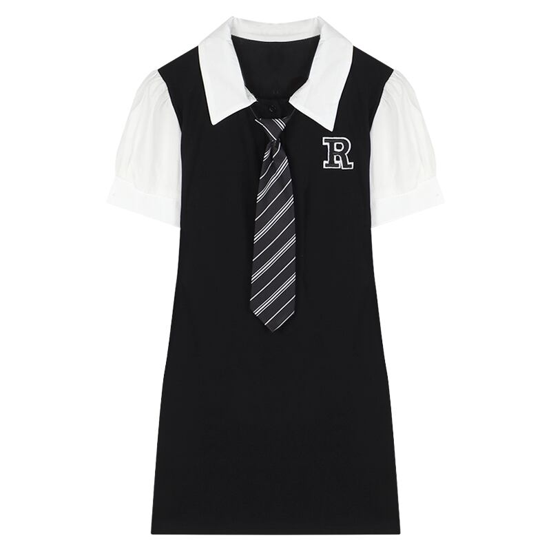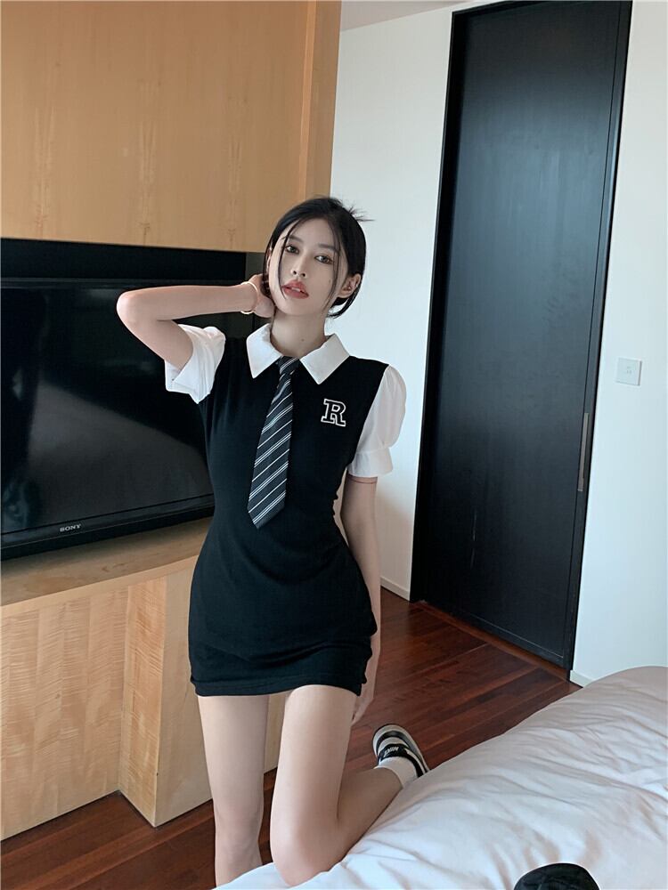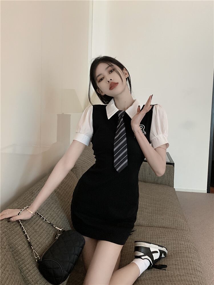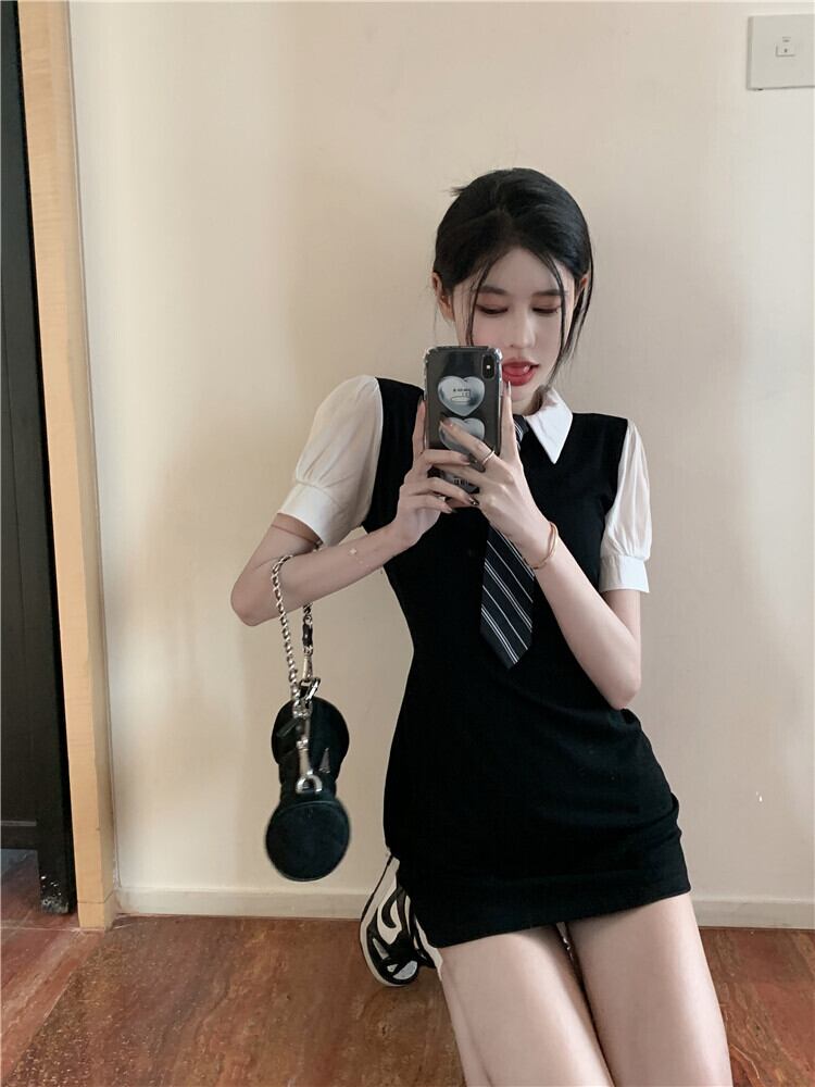 黒フェイク ツーピース半袖ドレス女性の 2022 年夏新しいステッチ jk unim バッグ ヒップ ショート スカート ブラック サマー 夏物 bstraw60307118006 | beaute25