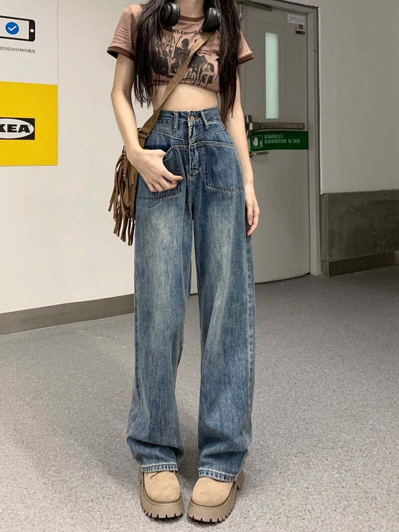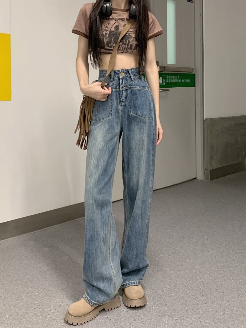 ブルードレープ ハイウエスト ストレート ジーンズ レディース サマー オールマッチ ルーズ デザイン センス 小さめ ワイドパンツ トラウザーズ ハイウェスト 夏物 bstraw43631439934 | beaute25