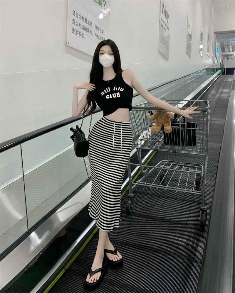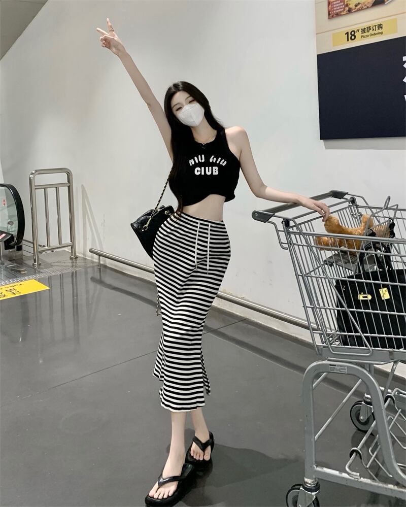 ドローストリング ストライプ スカートのバージョンの女性の 2022 年夏の新しいハイ ウエスト a ライン スリット ミッドレングス ヒップ スカート ハイウェスト サマー 夏物 Aライン bstraw83510507945 | beaute25