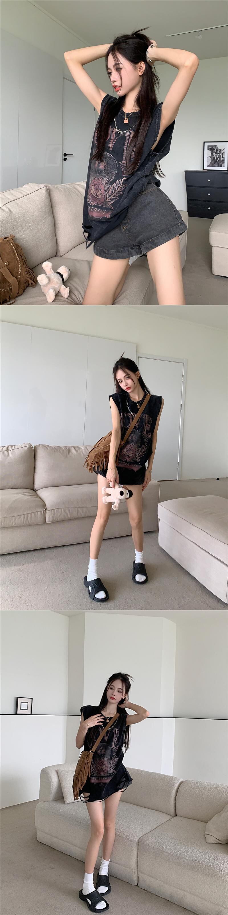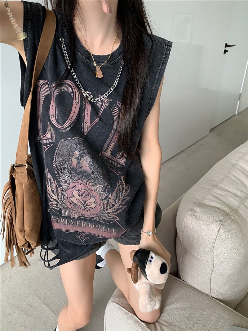 アメリカン レトロ リップド ベスト Tシャツ レディース 夏 ルーズ チェーン ノースリーブ ストリート プリント オールド ミドル丈 トップス サマー 夏物 bstraw50413272954 | beaute25