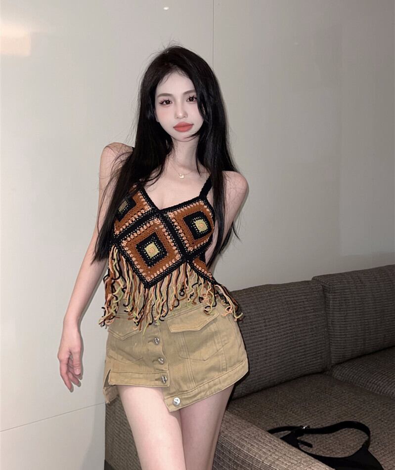 ボヘミアン ニット キャミソール レディース 夏 スイートスパイス ノースリーブ Vネック コントラスト フリンジ トップス アウター 大人ガーリー スウィート キュート カジュアル サマー 夏物 bstraw70477823040 | beaute25