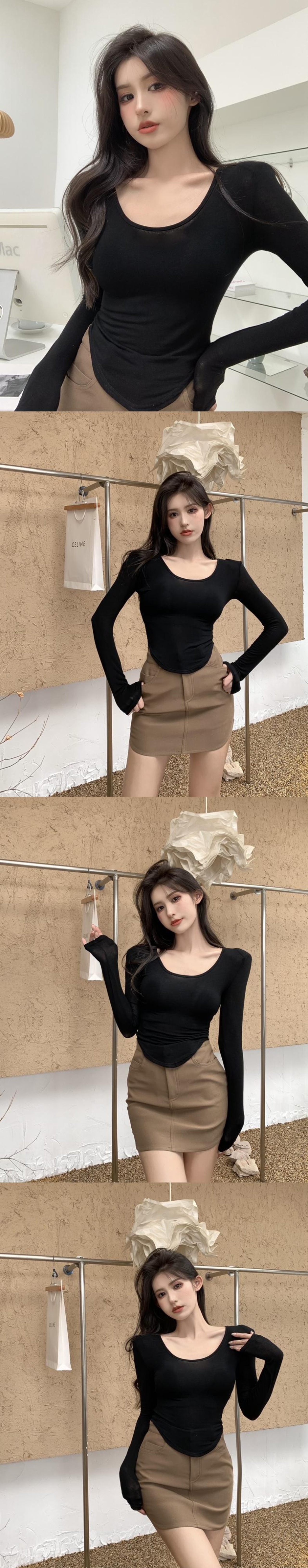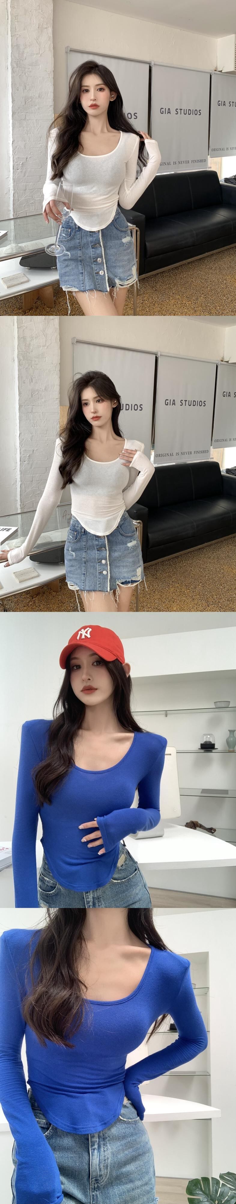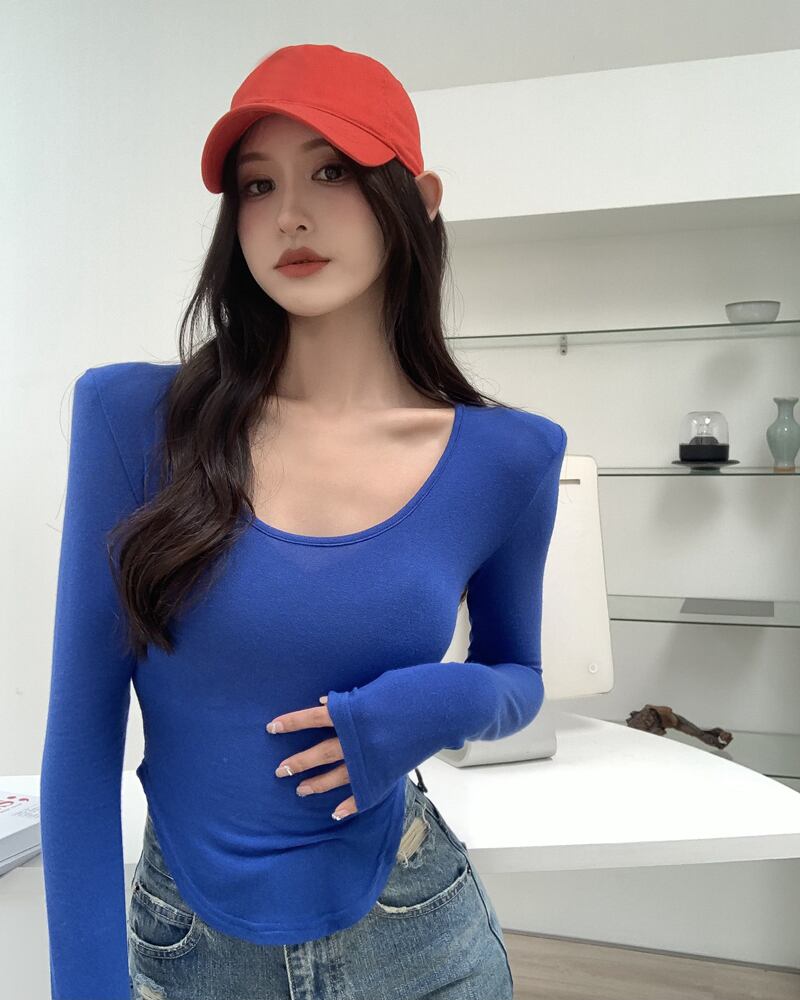 純粋な欲望肩パッド Tシャツ女性の秋ピンク u ネック薄いセクション パースペクティブ タイト フィット長袖セクシーなショート トップ ロング オータム 秋物 bstraw3501357325 | beaute25