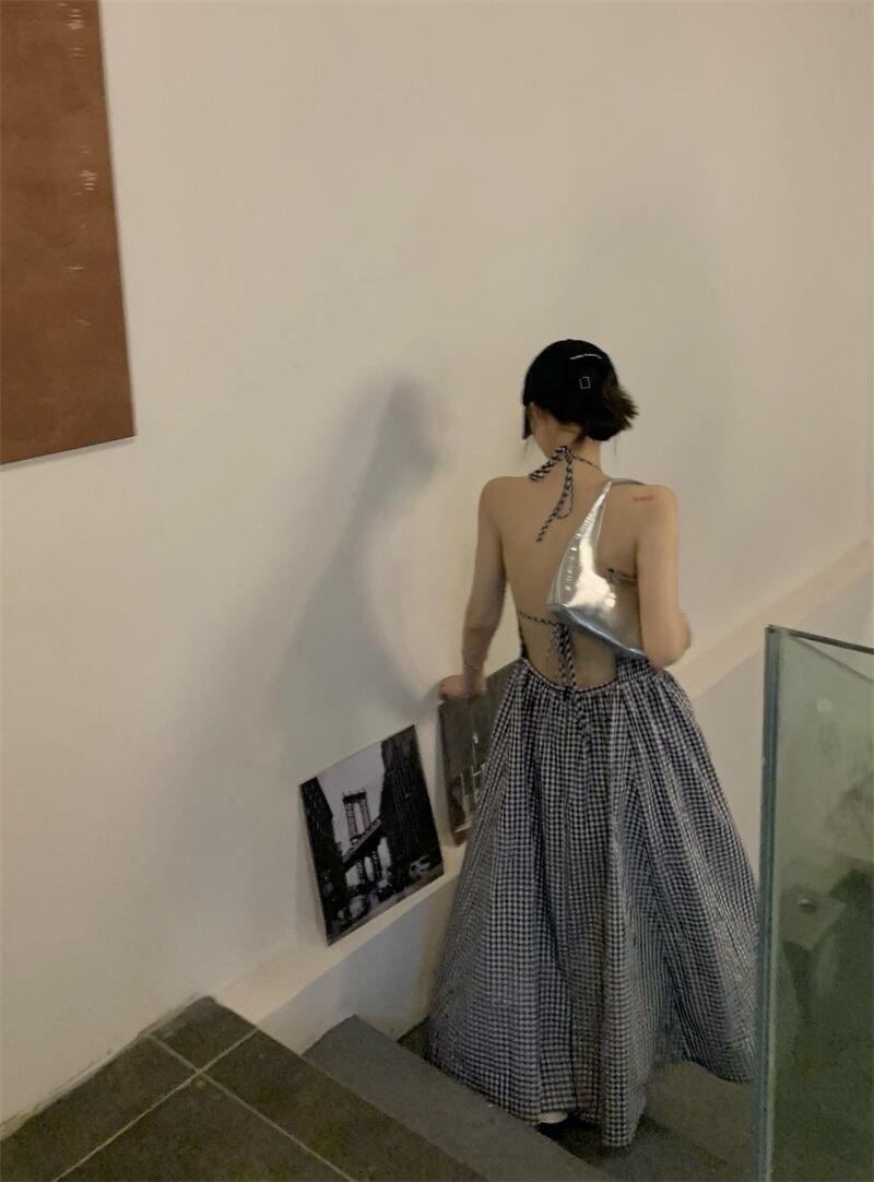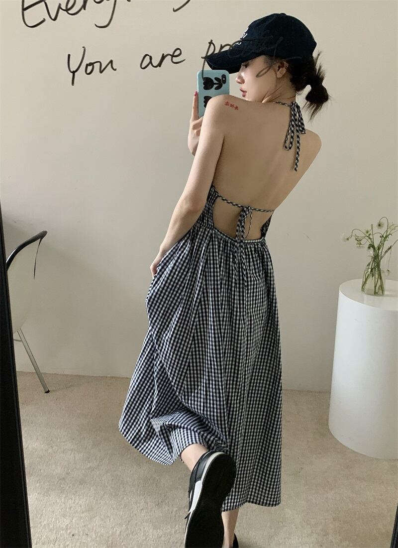 チェック柄のレトロなサスペンダー ホルター ドレスの女性の 2022 年夏新しいストラップ付きのセクシーな背中の開いたミッドレングス スカート サマー 夏物 bstraw99120570246 | beaute25
