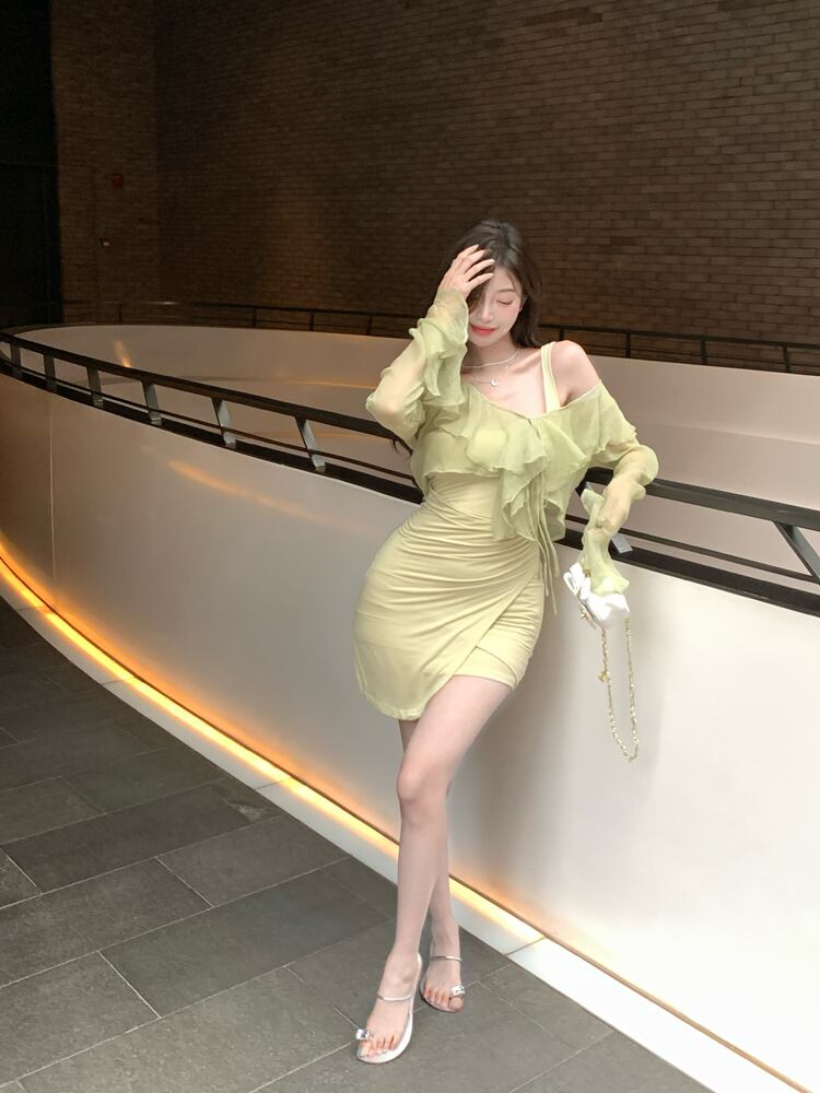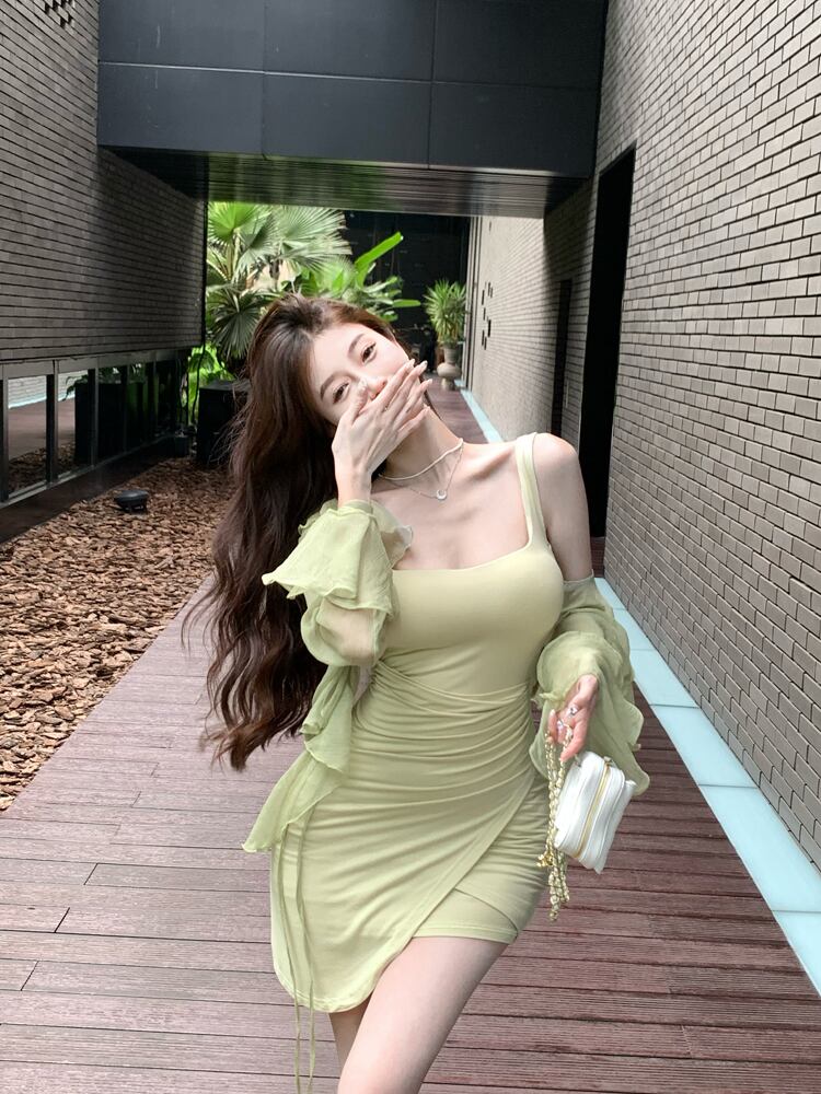 純粋な欲望風サスペンダー ドレス女性夏グリーン フレンチ スクエア カラー セクシー タイト フィット薄いバッグ ヒップ ショート スカート サマー 夏物 スクウェア bstraw31682962725 | beaute25