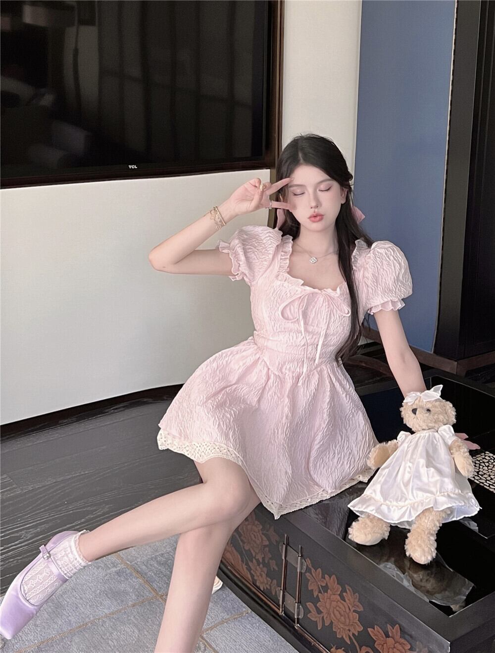 パフスリーブドレス女性の夏のピンクの穏やかな風のショートスカートフレンチスクエアカラーの甘いウエストの気質のふわふわのスカート 大人ガーリー スウィート キュート カジュアル サマー 夏物 スクウェア bstraw80570264382 | beaute25