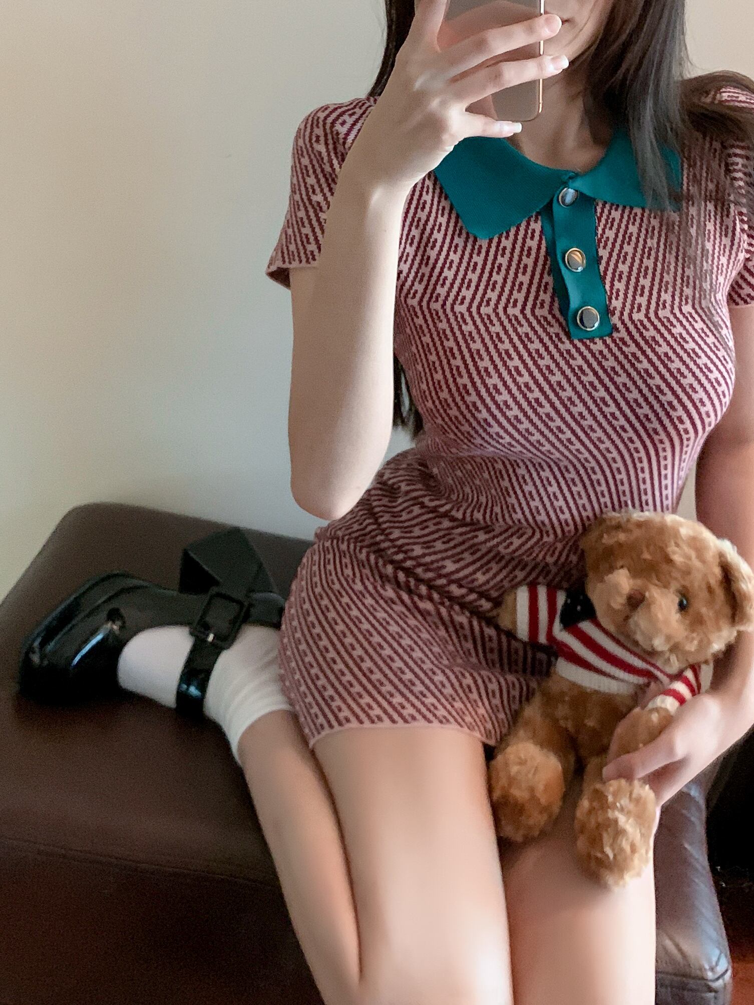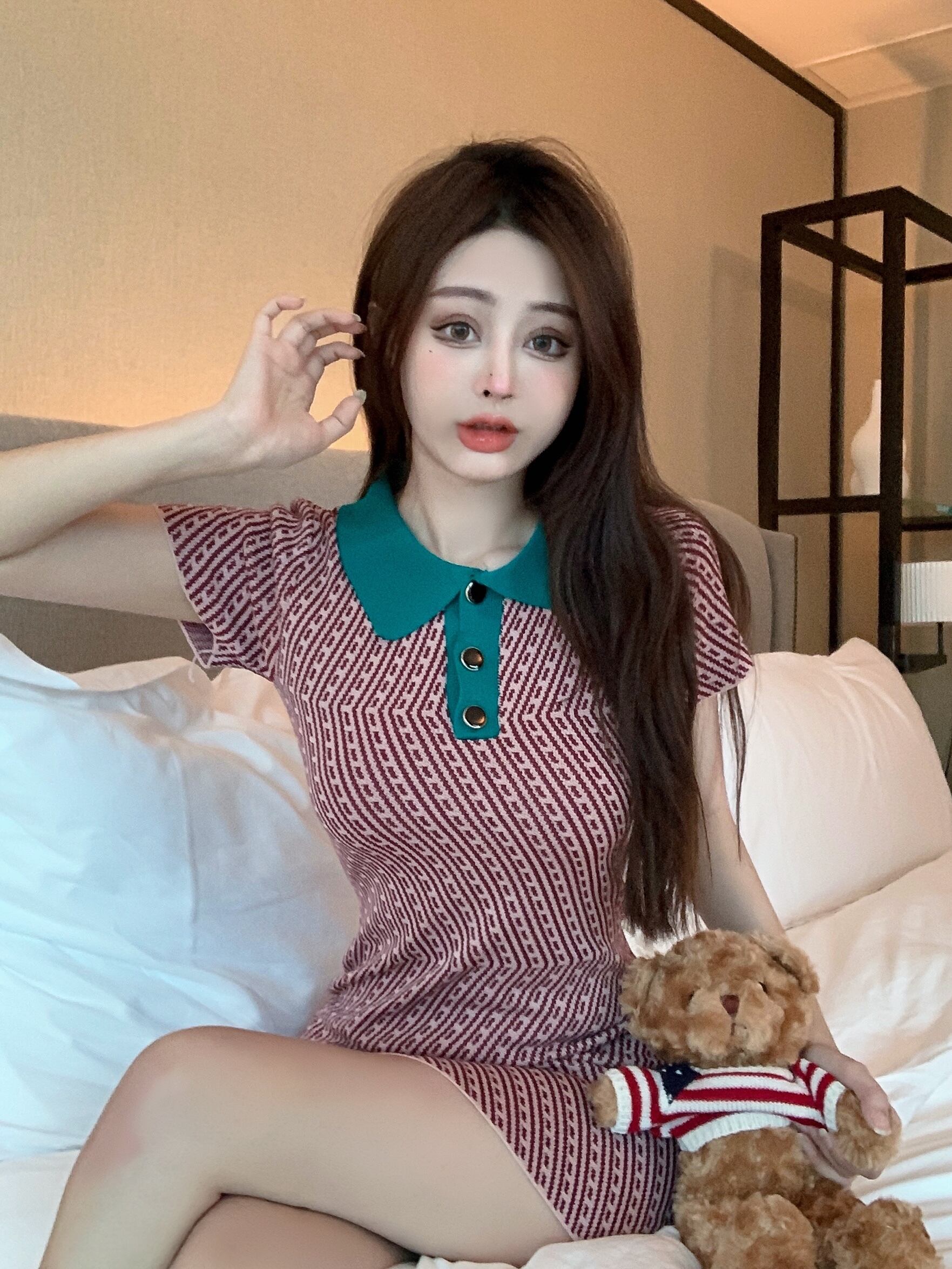 ニットドレス女性の夏のレトロな甘いポロ襟半袖ウエスト薄い気質バッグヒップショートスカート 大人ガーリー スウィート キュート カジュアル サマー 夏物 bstraw12953443355 | beaute25