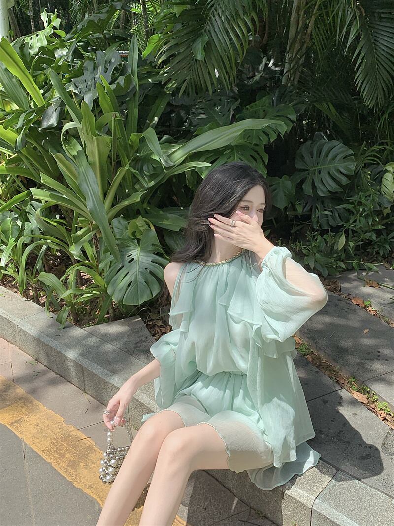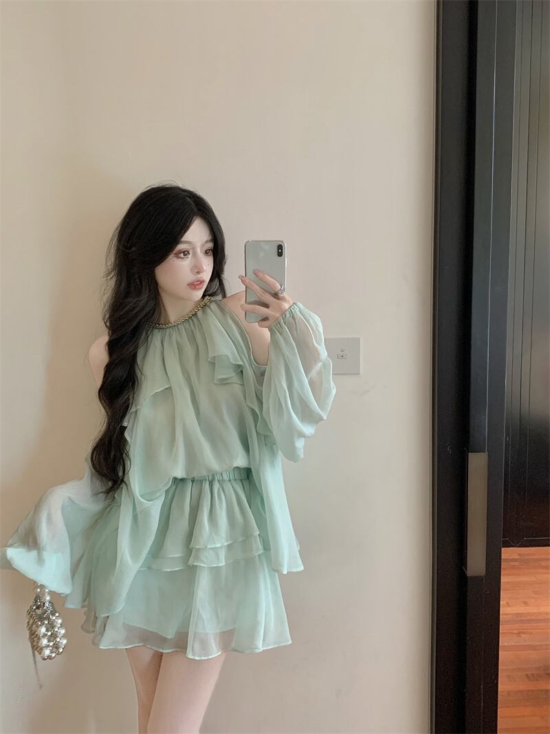 グリーン オフショルダー 長袖 シフォンシャツ 日焼け止め トップス レディース 秋 純情風 スーツ カジュアル ショーツ 2点セット ロング オータム 秋物 ブルマー ピュア bstraw59847528951 | beaute25