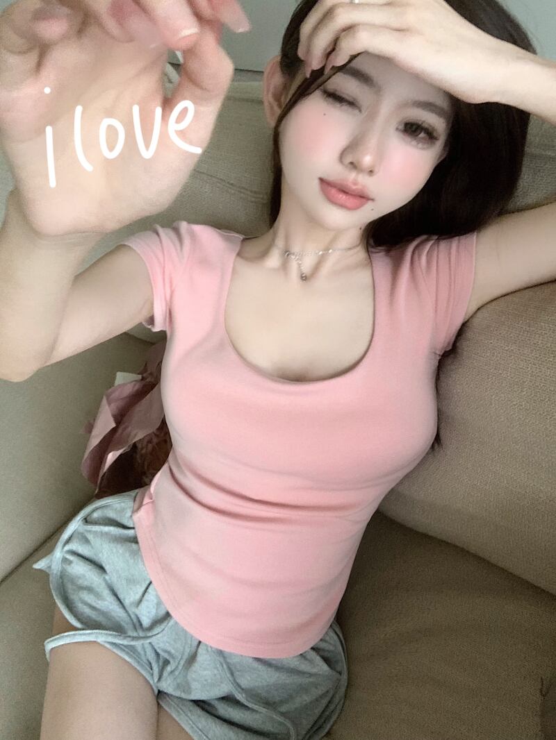 ホット u ネック半袖 tシャツ女性の 2022 夏の新しい純粋な欲望風小さなタイトフィット薄いショルダーウエストトップ サマー 夏物 ピュア bstraw46845375949 | beaute25