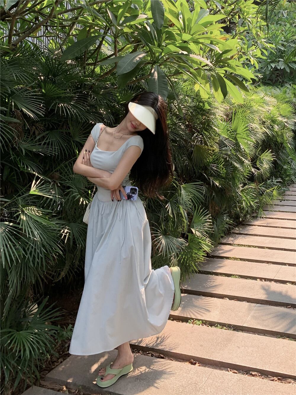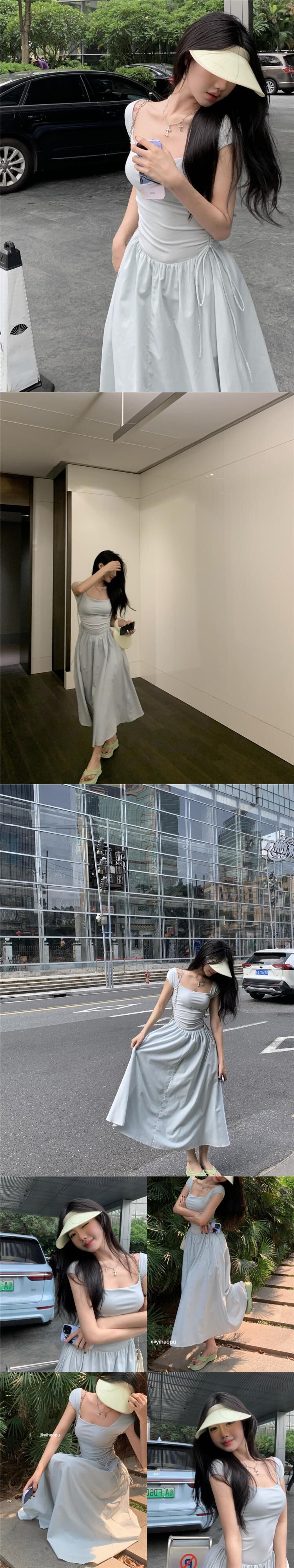 スパイスガールズ スクエアネック 半袖 ワンピース レディース 夏 雰囲気 タイト ドローストリング 丁寧なステッチ ミドル丈 スカート ショート ハーフスリーブ サマー 夏物 スクウェア bstraw14594139221 | beaute25