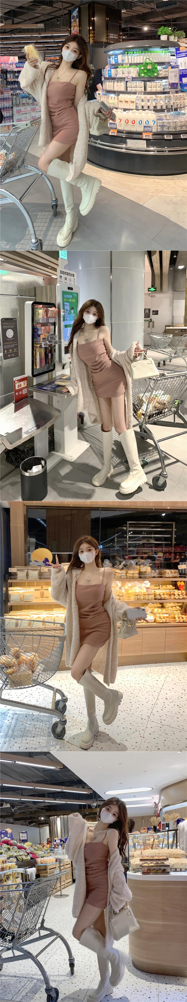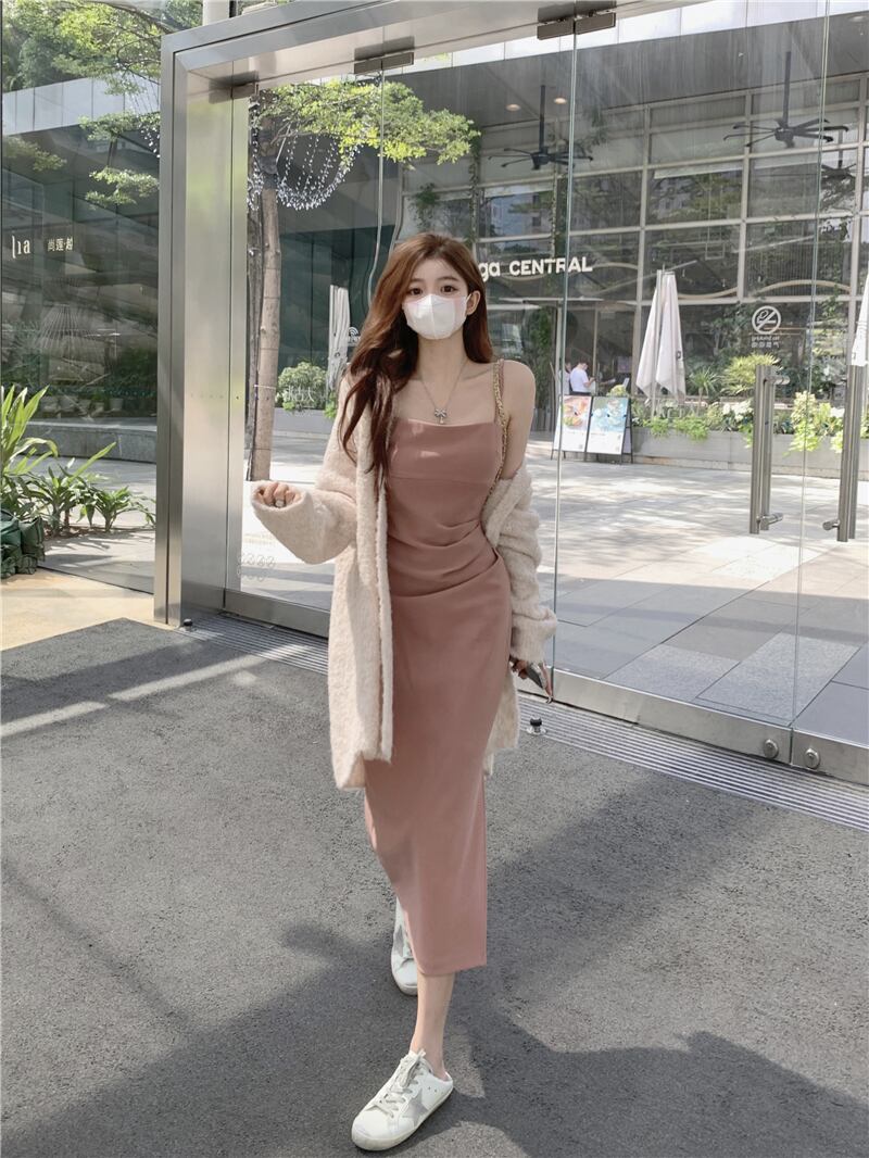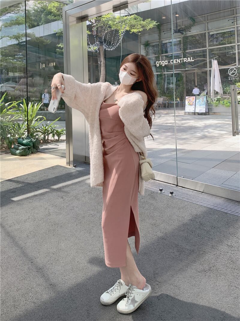 色:ピンクのサスペンダースカート,ピンクのスリングドレス,白いカーディガン