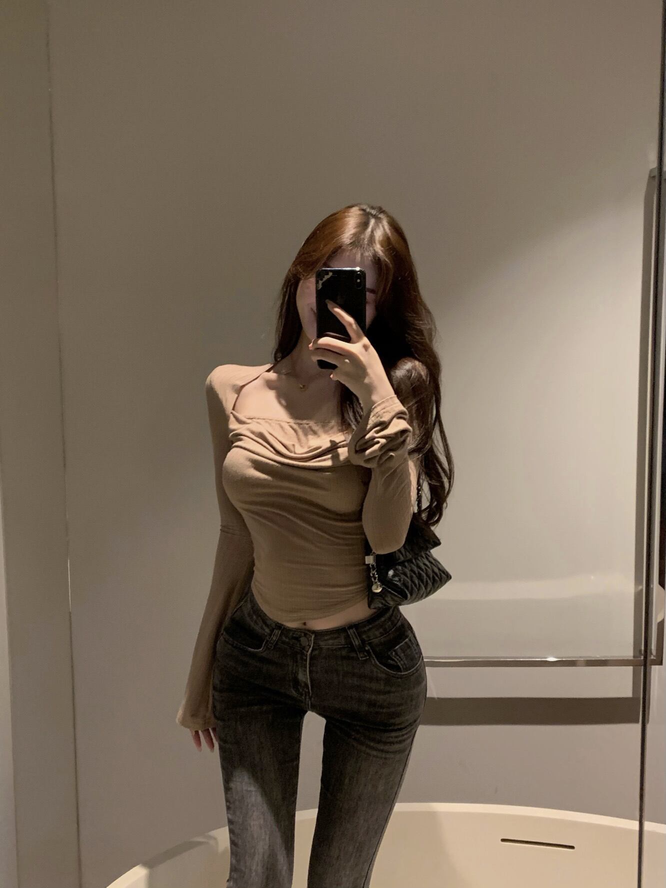 純粋な欲望 Tシャツ女性のショートホットガールスクエアカラーセクシーな底入れシャツ秋不規則なスリムフィット薄手の長袖トップ ロング オータム 秋物 スクウェア bstraw49913535557 | beaute25