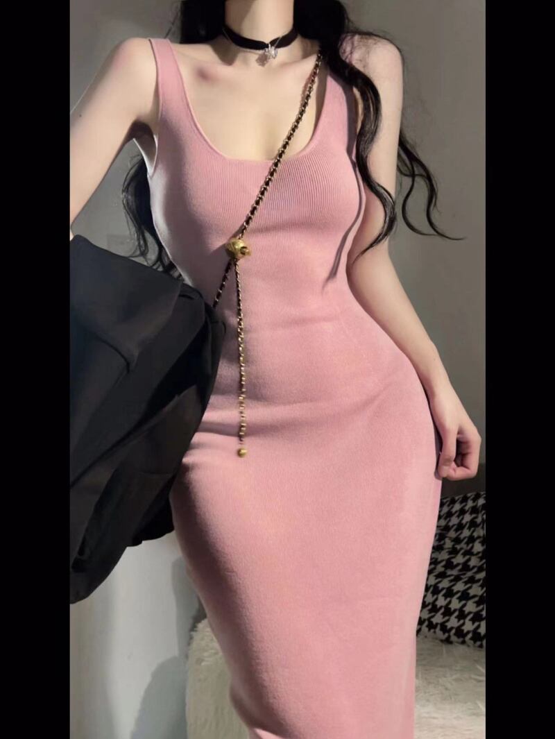 純粋な欲望スタイル ピンク ニット サスペンダー ドレス女性の秋のセクシーなスリムなウエスト ミッドレングス ヒップ スカート オータム 秋物 bstraw88405837846 | beaute25