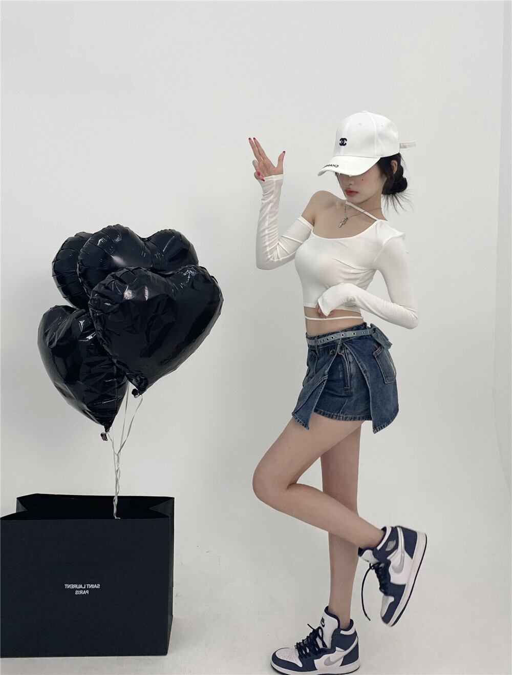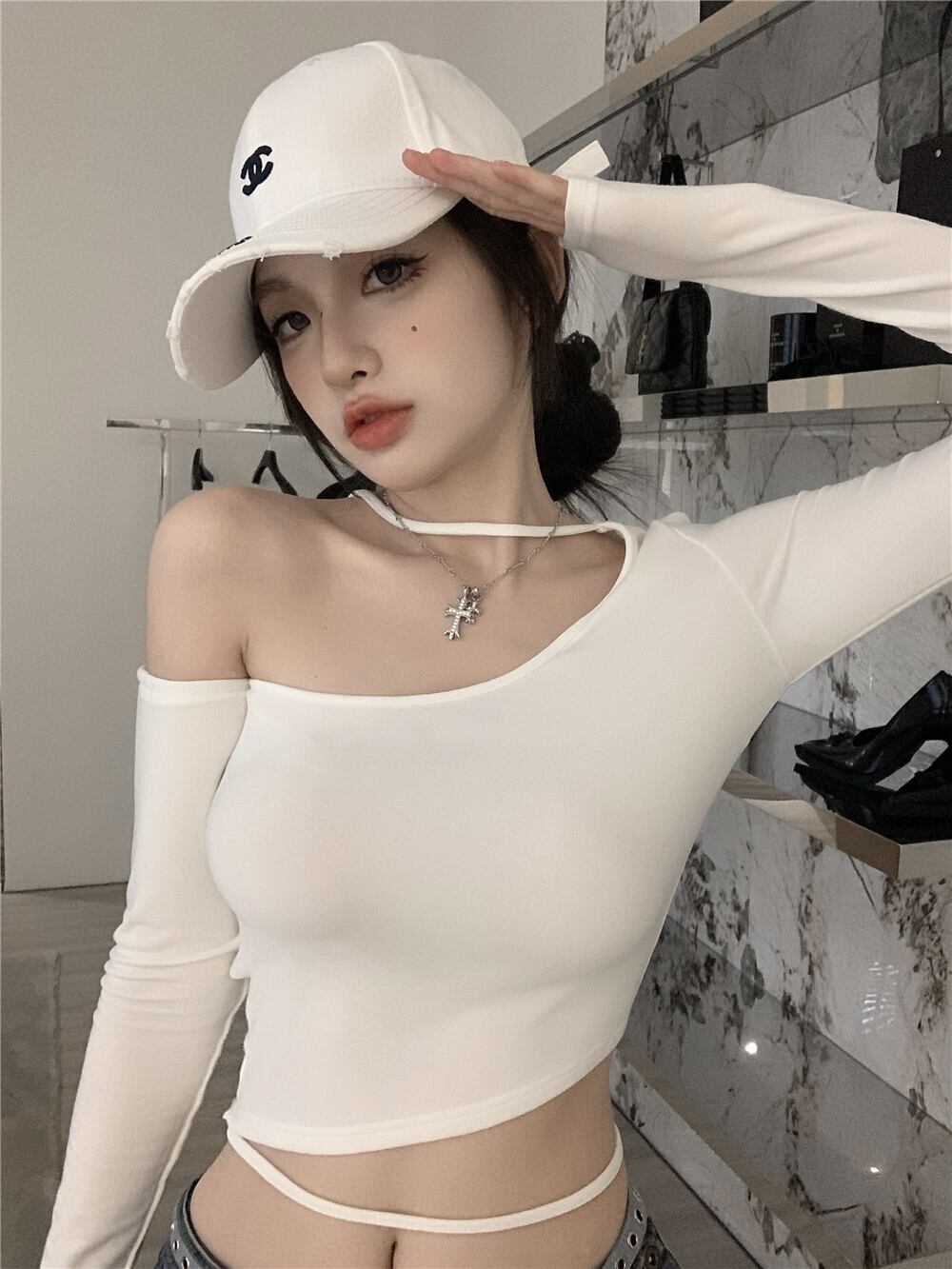ブラック ストラップレス オフショルダー 長袖 Tシャツ レディース 秋 ショート デザイン 不規則 日焼け止め 底入れ シャツ トップ ロング オータム 秋物 bstraw52219413493 | beaute25