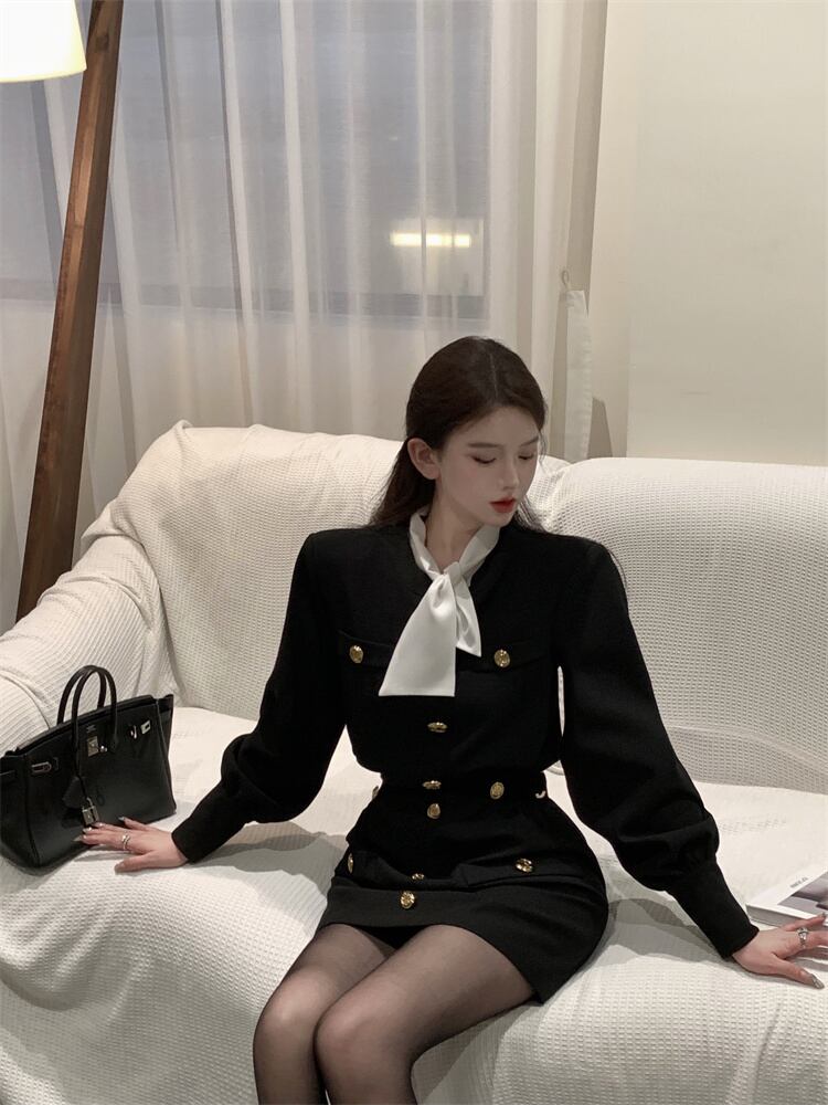 黒の小さなフレグランススタイルの長袖ドレスの女性の2022年秋の新しいフレンチハイエンドショートスカート気質パッケージヒップスカート ロング ブラック オータム 秋物 bstraw79290631788 | beaute25