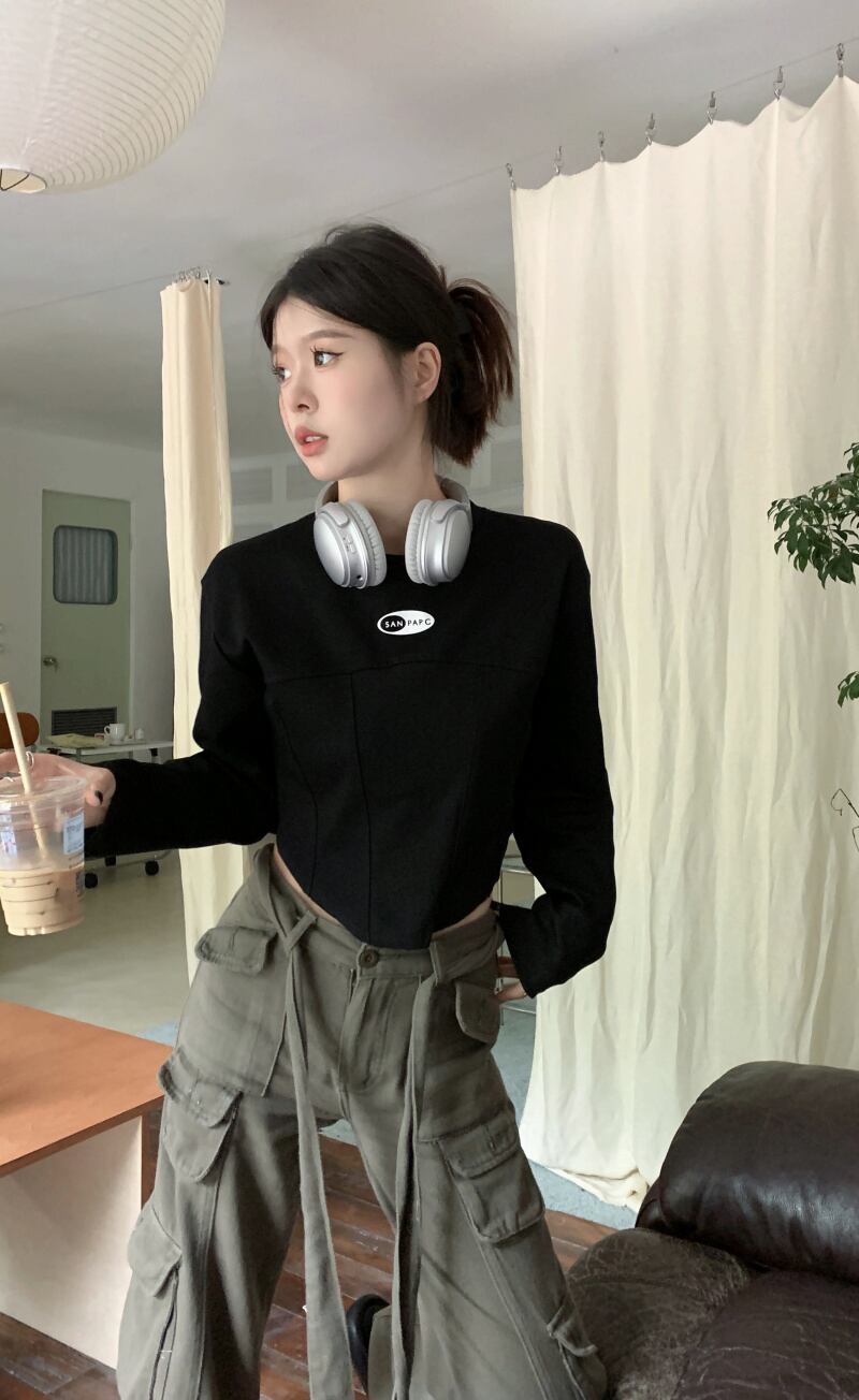 ブラック フィッシュボーン 長袖 Tシャツ レディース 秋 スリムフィット クロップド へそ カーブヘム イレギュラー セクシー ショートトップ ロング オータム 秋物 bstraw46054193711 | beaute25