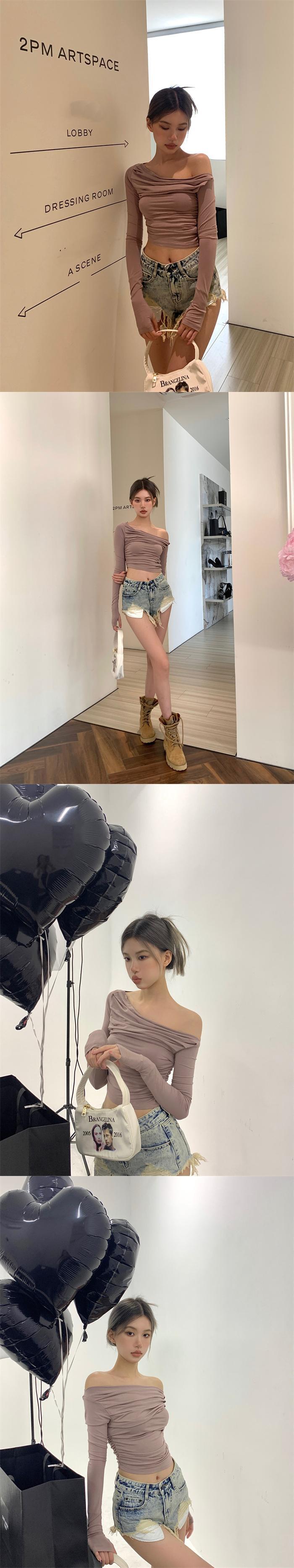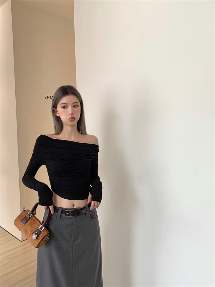 ブラック ワンショルダー 長袖 Tシャツ レディース 秋のデザインセンス ニッチ セクシー タイトフィット 薄手 ショートトップ ロング オータム 秋物 bstraw16450984159 | beaute25