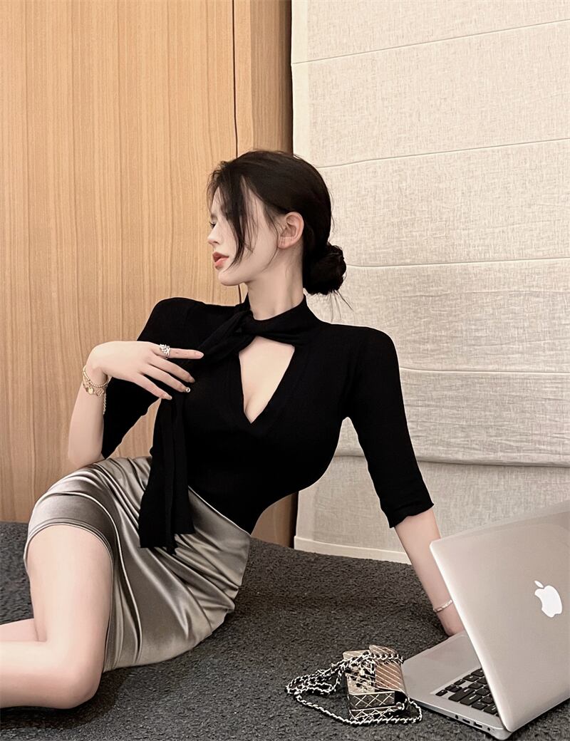 黒 v ネック半袖ニット t シャツ女性の夏の薄いセクション ピュア ラスト スタイル半袖セクシー タイトなボトムス シャツ トップ ブラック サマー 夏物 Vネック Tシャツ bstraw14223608193 | beaute25