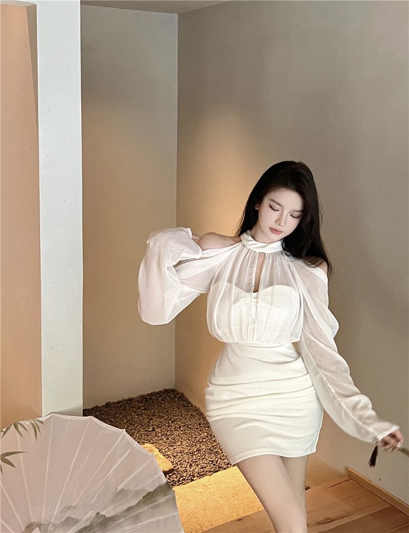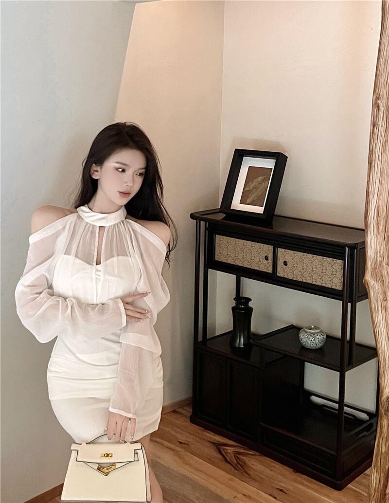フランスのハイエンド オフショルダー長袖シフォン ドレス女性の秋のメッシュ ステッチ ウエスト バンド気質バッグ ヒップ ショート スカート ロング オータム 秋物 bstraw75136673281 | beaute25