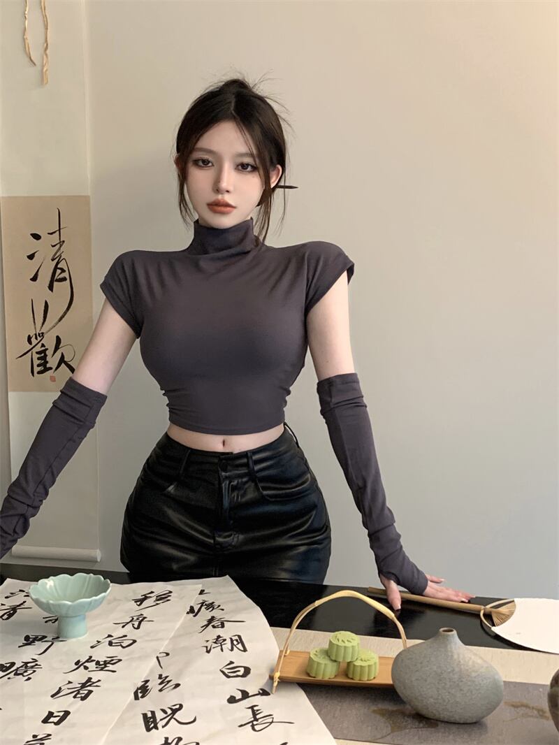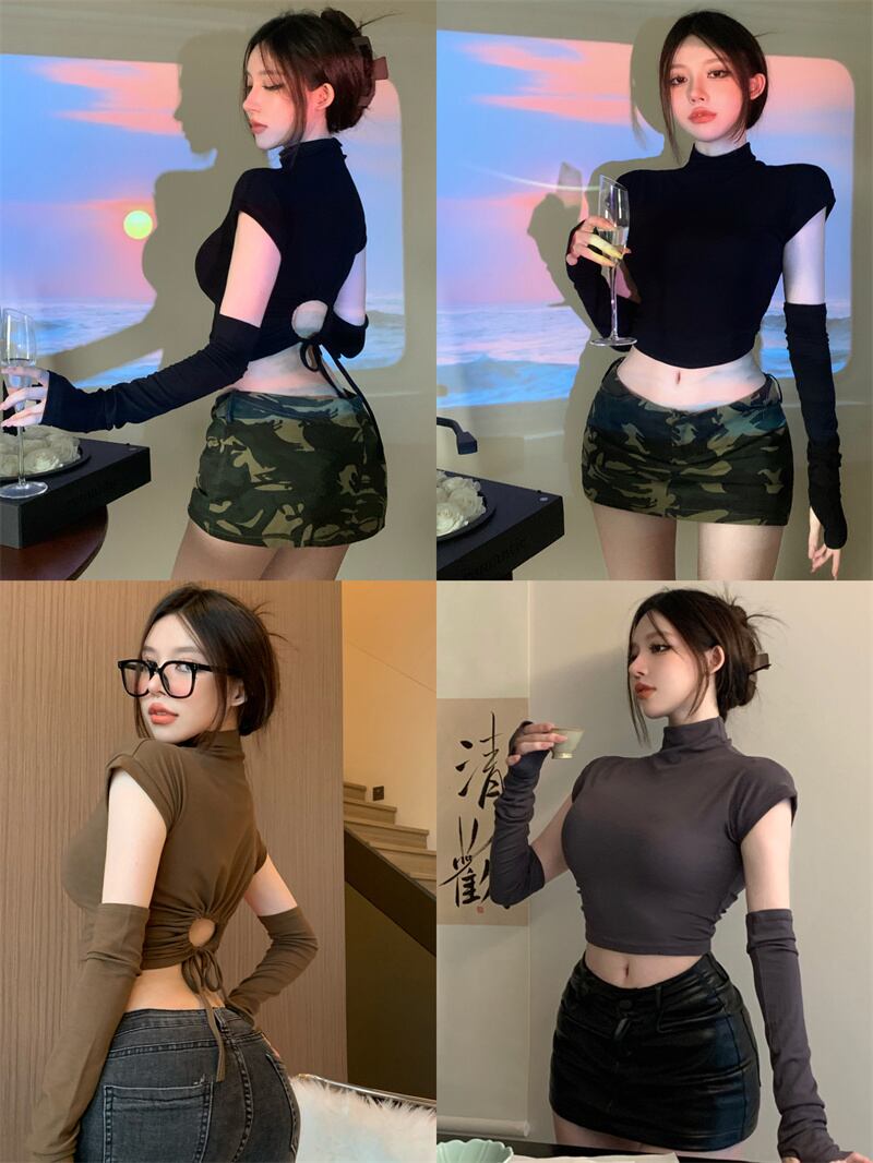 ピュアデザイアスタイルハーフタートルネック半袖Tシャツサマーブラックホットガールショートスリムバックレスストラップボトムシャツトップ ハーフスリーブ 夏物 bstraw19328033334 | beaute25