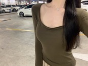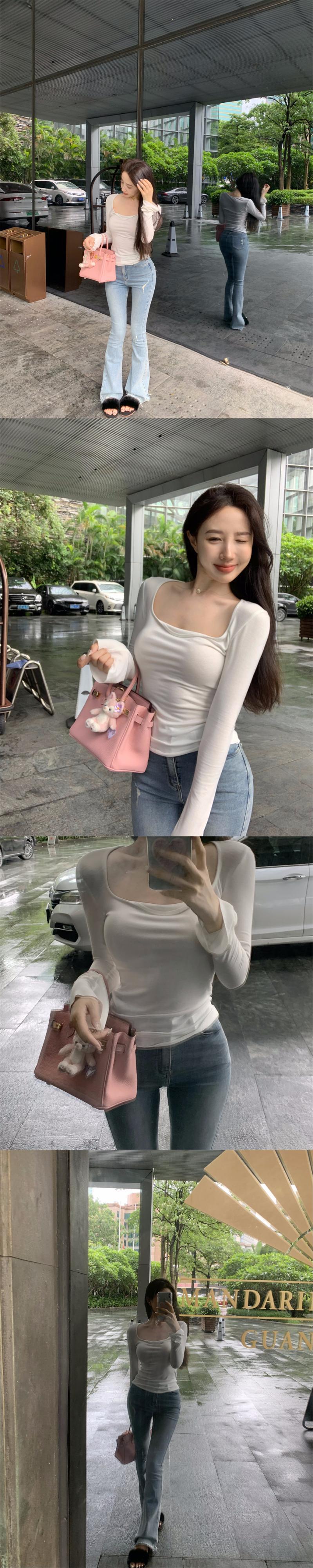 グリーンスクエアネック長袖Tシャツレディース秋セクシー鎖骨デザイン無地スリムウエスト底入れトップ ロング オータム 秋物 ソリッドカラー スクウェア bstraw32235863107 | beaute25