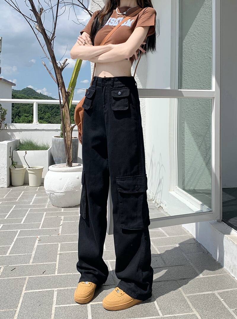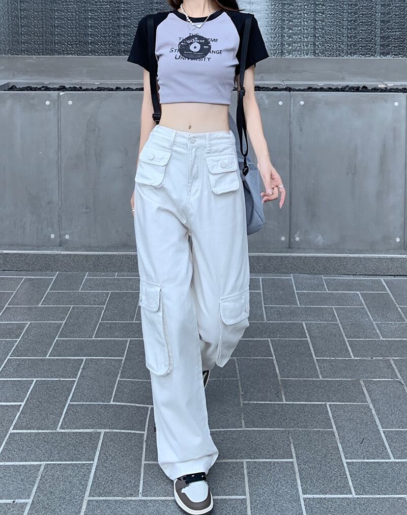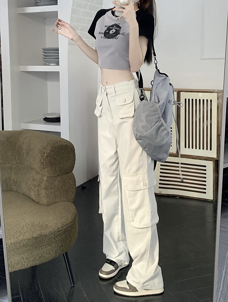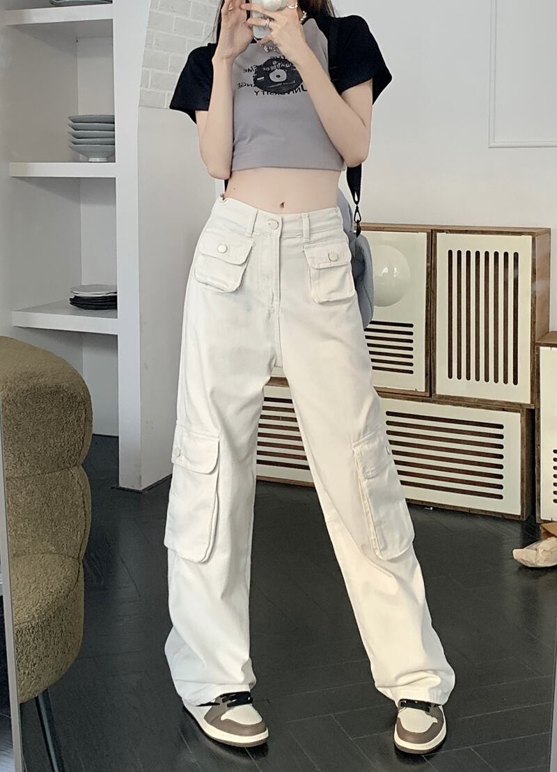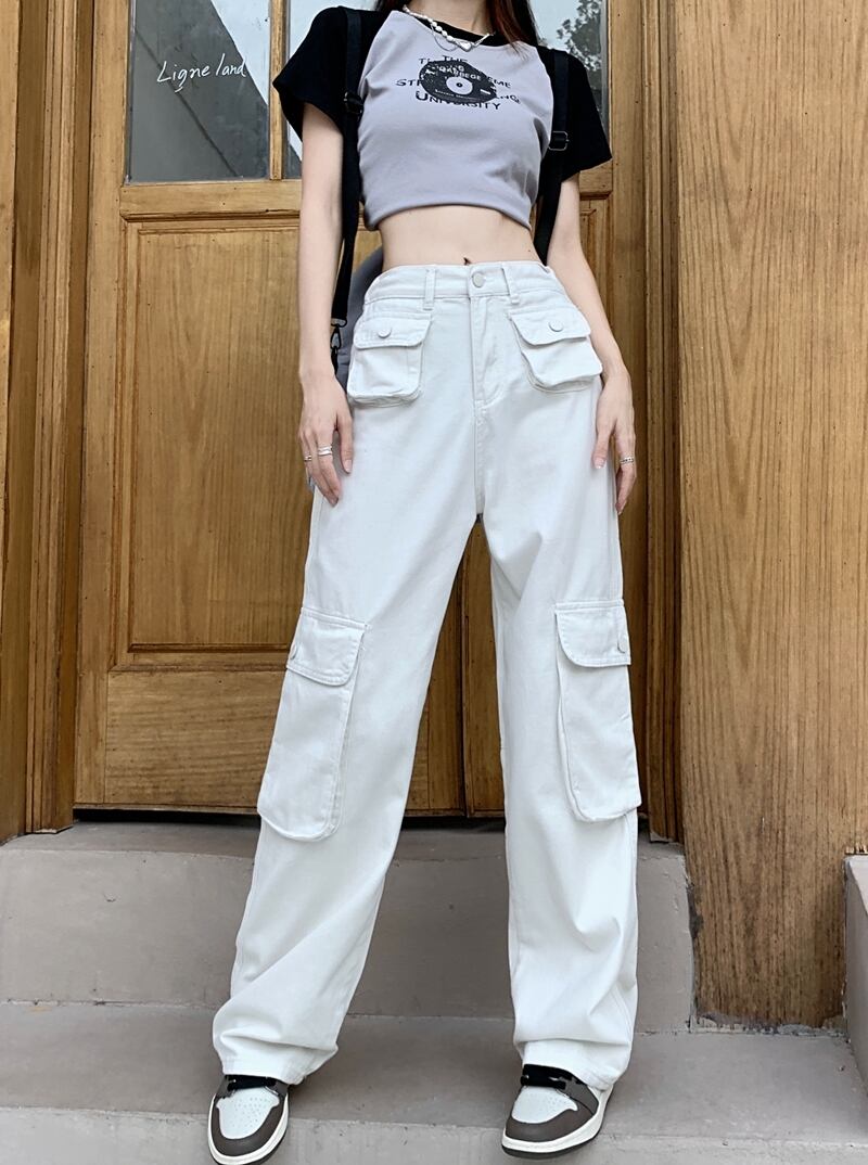オフホワイトのオーバーオール女性の薄いカジュアルなデニムのズボン小さな秋のハイウエストストレートワイドレッグモップパンツ ハイウェスト オータム 秋物 ワイドパンツ bstraw6862379565 | beaute25