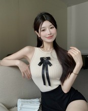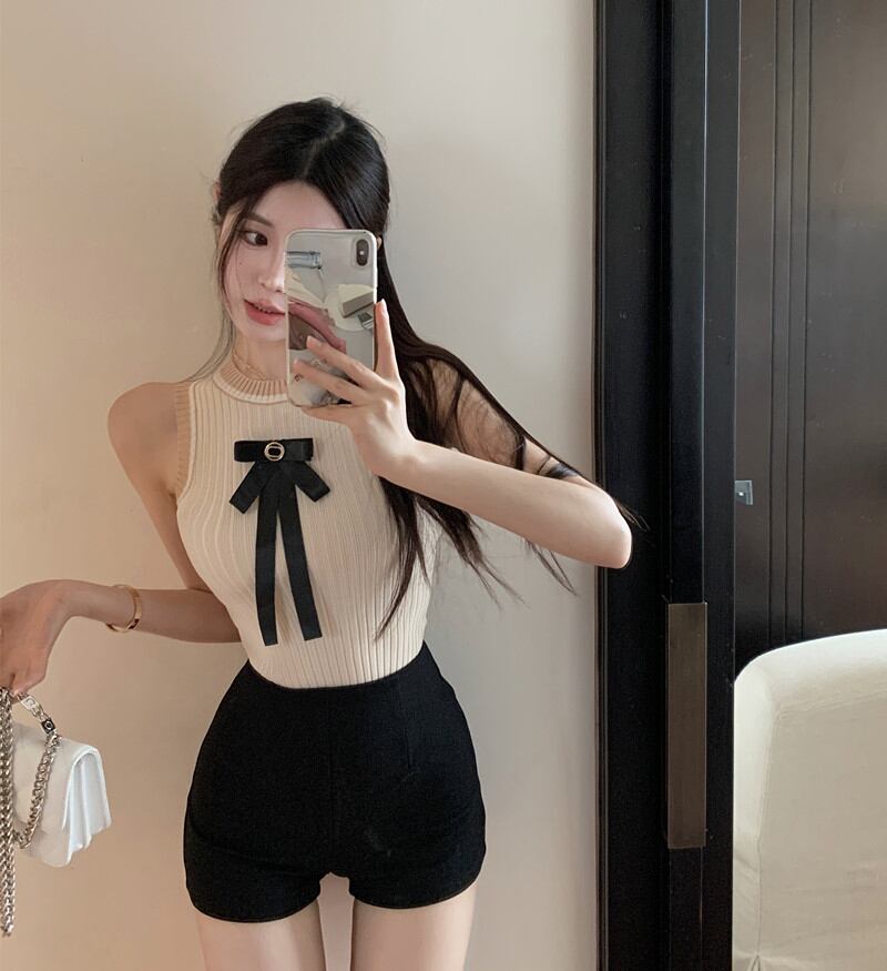 ホット ショート ニット キャミソール女性の夏の純粋な欲望タイト フィット セクシー ノースリーブ ディグ ショルダー ボウ トップ アウターウェア リボン サマー 夏物 ピュア bstraw6257130524 | beaute25