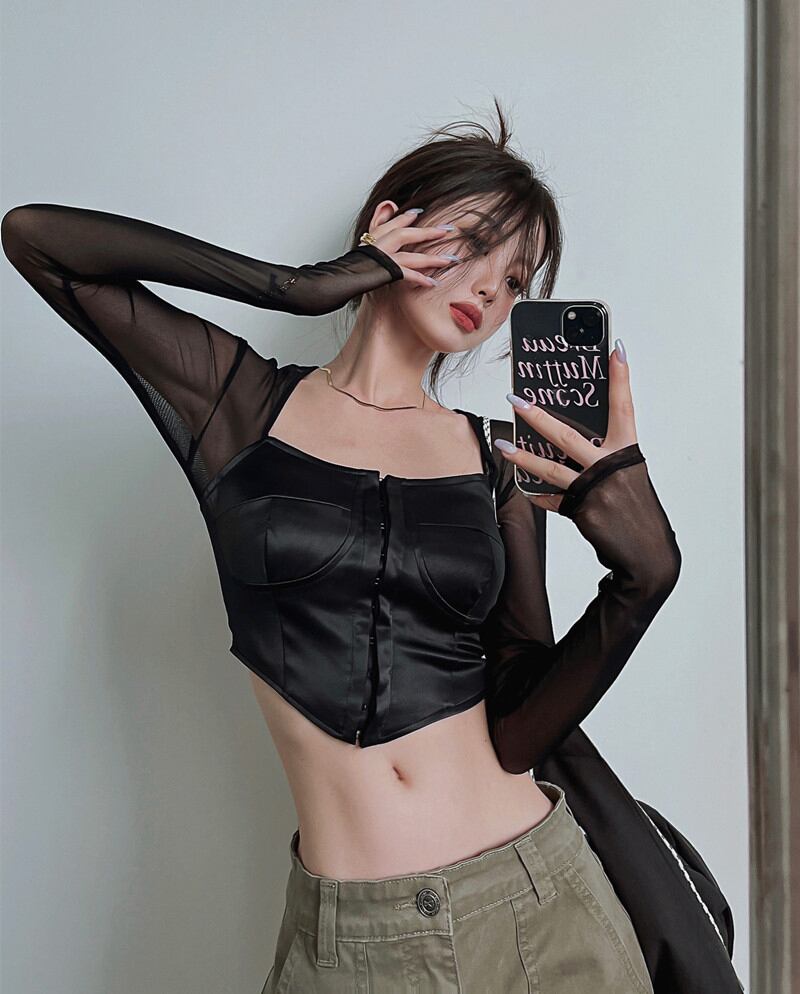 ホットブラックスクエアカラー長袖Tシャツ女性の秋のセクシーなタイトフィッティング不規則なメッシュステッチシックなショートトップ ロング オータム 秋物 スクウェア bstraw21758801204 | beaute25