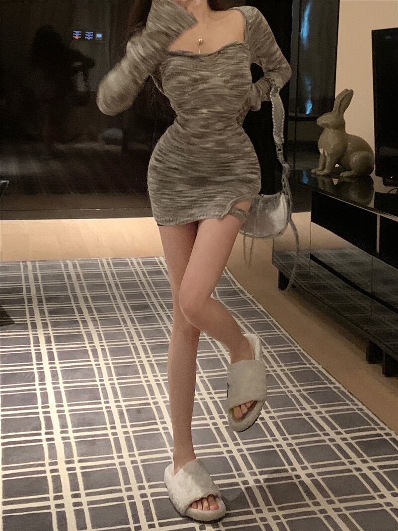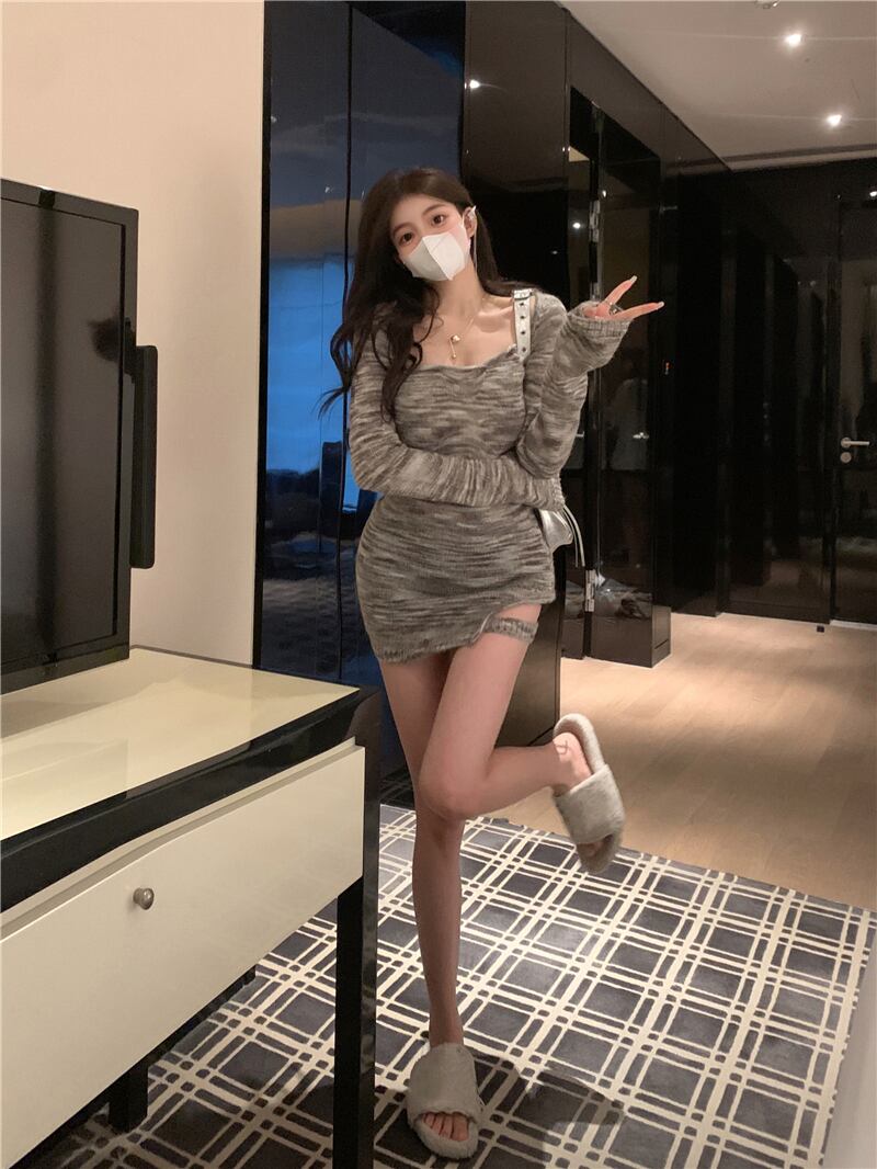 グレー長袖ニットドレス女性の秋の純粋な欲望風ウエストスクエアネックショートスカートセクシーヒップスカート ロング オータム 秋物 ピュア スクウェア bstraw25402221082 | beaute25